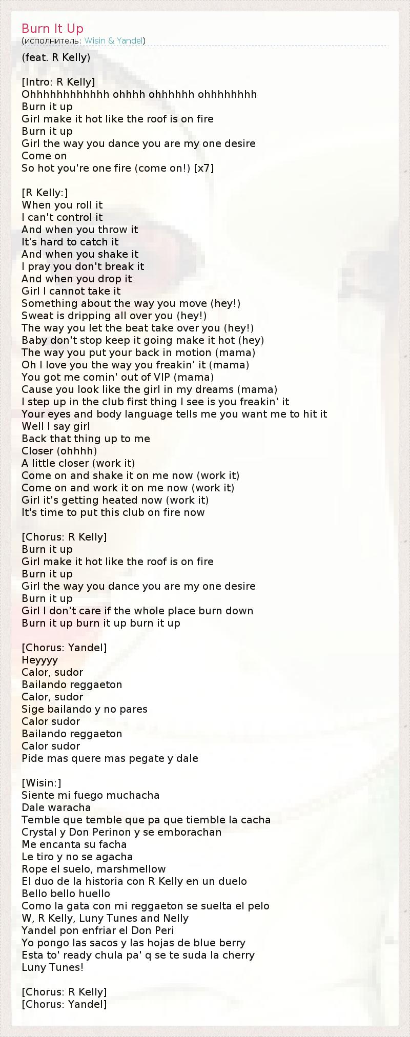 (feat. R Kelly) [Intro: R Kelly] Ohhhhhhhhhhhh ohhhh ohhhhhh ohhhhhhhh Burn it up Girl make it hot like the roof is on fire Burn it up Girl the way you dance you are my one desire Come on So hot you're one fire (come on!) [x7] [R Kelly:] When you roll it I can't control it And when you throw it It's hard to catch it And when you shake it I pray you don't break it And when you drop it Girl I cannot take it Something about the way you move (hey!) Sweat is dripping all over you (hey!) The way you let the beat take over you (hey!) Baby don't stop keep it going make it hot (hey) The way you put your back in motion (mama) Oh I love you the way you freakin' it (mama) You got me comin' out of VIP (mama) Cause you look like the girl in my dreams (mama) I step up in the club first thing I see is you freakin' it Your eyes and body language tells me you want me to hit it Well I say girl Back that thing up to me Closer (ohhhh) A little closer (work it) Come on and shake it on me now (work it) Come on and work it on me now (work it) Girl it's getting heated now (work it) It's time to put this club on fire now [Chorus: R Kelly] Burn it up Girl make it hot like the roof is on fire Burn it up Girl the way you dance you are my one desire Burn it up Girl I don't care if the whole place burn down Burn it up burn it up burn it up [Chorus: Yandel] Heyyyy Calor, sudor Bailando reggaeton Calor, sudor Sige bailando y no pares Calor sudor Bailando reggaeton Calor sudor Pide mas quere mas pegate y dale [Wisin:] Siente mi fuego muchacha Dale waracha Temble que temble que pa que tiemble la cacha Crystal y Don Perinon y se emborachan Me encanta su facha Le tiro y no se agacha Rope el suelo, marshmellow El duo de la historia con R Kelly en un duelo Bello bello huello Como la gata con mi reggaeton se suelta el pelo W, R Kelly, Luny Tunes and Nelly Yandel pon enfriar el Don Peri Yo pongo las sacos y las hojas de blue berry Esta to' ready chula pa' q se te suda la cherry Luny Tunes! [Chorus: R Kelly] [Chorus: Yandel]