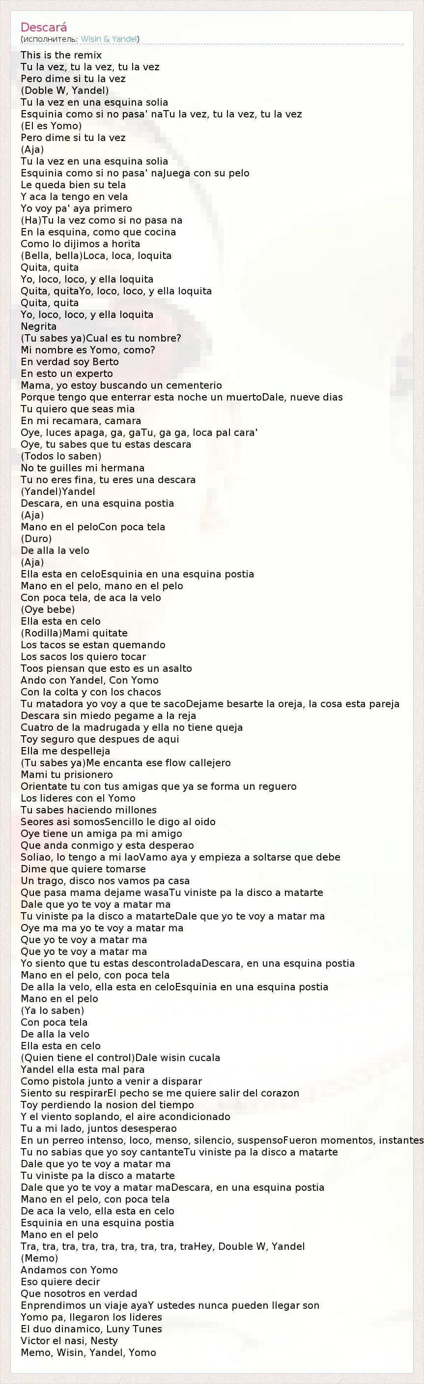 Это интересно:Wisin (Juan Luis Morera Luna ) - 19.12.1978Yandel (Llandel Veguilla Malave) - 14.01.1977Wisin (Juan Luis Morera Luna) и Yandel (Llandel Veguilla Malave) родились в городе Cayey, Puerto – Rico, где они и познакомились. Перед началом их музыкальной карьеры Yandel работал парикмахером, в то время как Wisin играл в театре. Тем не менее, оба разделили общие музыкальные интересы.В 1998 году они работали с DJ Dicky над его альбомом «No Fear 3». В следующем году они были подписаны... продолжение