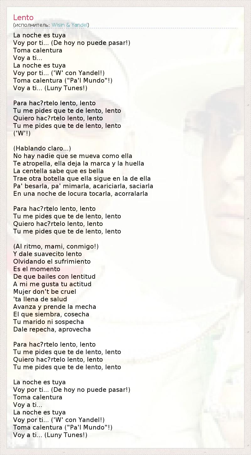 Это интересно:Wisin (Juan Luis Morera Luna ) - 19.12.1978Yandel (Llandel Veguilla Malave) - 14.01.1977Wisin (Juan Luis Morera Luna) и Yandel (Llandel Veguilla Malave) родились в городе Cayey, Puerto – Rico, где они и познакомились. Перед началом их музыкальной карьеры Yandel работал парикмахером, в то время как Wisin играл в театре. Тем не менее, оба разделили общие музыкальные интересы.В 1998 году они работали с DJ Dicky над его альбомом «No Fear 3». В следующем году они были подписаны... продолжение