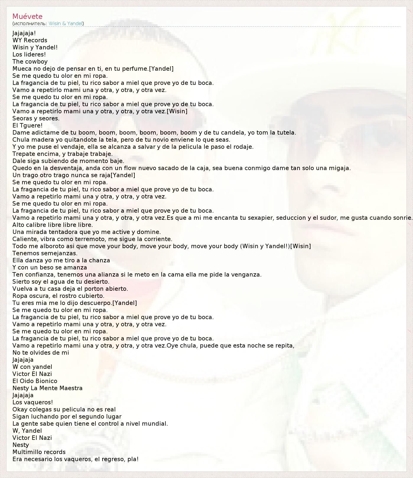 Это интересно:Wisin (Juan Luis Morera Luna ) - 19.12.1978Yandel (Llandel Veguilla Malave) - 14.01.1977Wisin (Juan Luis Morera Luna) и Yandel (Llandel Veguilla Malave) родились в городе Cayey, Puerto – Rico, где они и познакомились. Перед началом их музыкальной карьеры Yandel работал парикмахером, в то время как Wisin играл в театре. Тем не менее, оба разделили общие музыкальные интересы.В 1998 году они работали с DJ Dicky над его альбомом «No Fear 3». В следующем году они были подписаны... продолжение