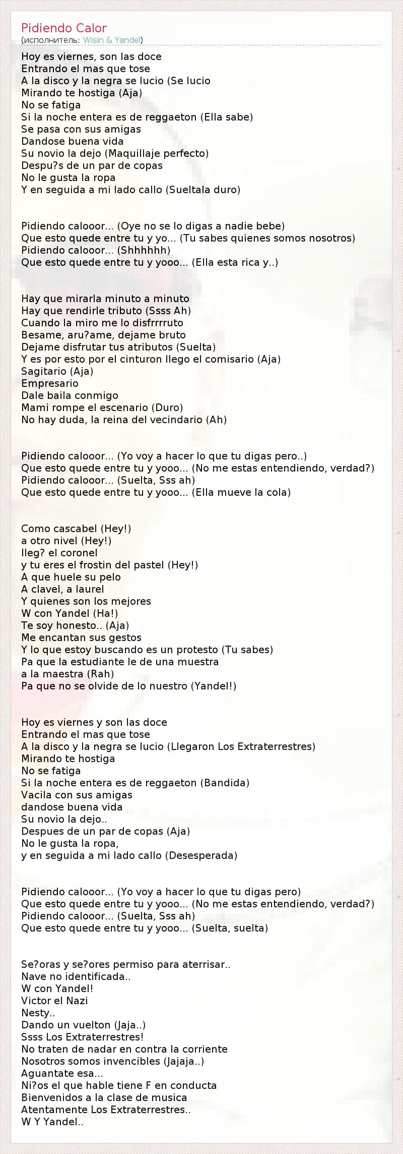 Hoy es viernes, son las doce Entrando el mas que tose A la disco y la negra se lucio (Se lucio Mirando te hostiga (Aja) No se fatiga Si la noche entera es de reggaeton (Ella sabe) Se pasa con sus amigas Dandose buena vida Su novio la dejo (Maquillaje perfecto) Despu?s de un par de copas No le gusta la ropa Y en seguida a mi lado callo (Sueltala duro) Pidiendo calooor... (Oye no se lo digas a nadie bebe) Que esto quede entre tu y yo... (Tu sabes quienes somos nosotros) Pidiendo calooor... (Shhhhhh) Que esto quede entre tu y yooo... (Ella esta rica y..) Hay que mirarla minuto a minuto Hay que rendirle tributo (Ssss Ah) Cuando la miro me lo disfrrrruto Besame, aru?ame, dejame bruto Dejame disfrutar tus atributos (Suelta) Y es por esto por el cinturon llego el comisario (Aja) Sagitario (Aja) Empresario Dale baila conmigo Mami rompe el escenario (Duro) No hay duda, la reina del vecindario (Ah) Pidiendo calooor... (Yo voy a hacer lo que tu digas pero..) Que esto quede entre tu y yooo... (No me estas entendiendo, verdad?) Pidiendo calooor... (Suelta, Sss ah) Que esto quede entre tu y yooo... (Ella mueve la cola) Como cascabel (Hey!) a otro nivel (Hey!) lleg? el coronel y tu eres el frostin del pastel (Hey!) A que huele su pelo A clavel, a laurel Y quienes son los mejores W con Yandel (Ha!) Te soy honesto.. (Aja) Me encantan sus gestos Y lo que estoy buscando es un protesto (Tu sabes) Pa que la estudiante le de una muestra a la maestra (Rah) Pa que no se olvide de lo nuestro (Yandel!) Hoy es viernes y son las doce Entrando el mas que tose A la disco y la negra se lucio (Llegaron Los Extraterrestres) Mirando te hostiga No se fatiga Si la noche entera es de reggaeton (Bandida) Vacila con sus amigas dandose buena vida Su novio la dejo.. Despues de un par de copas (Aja) No le gusta la ropa, y en seguida a mi lado callo (Desesperada) Pidiendo calooor... (Yo voy a hacer lo que tu digas pero) Que esto quede entre tu y yooo... (No me estas entendiendo, verdad?) Pidiendo calooor... (Suelta, Sss ah) Que esto quede entre tu y yooo... (Suelta, suelta) Se?oras y se?ores permiso para aterrisar.. Nave no identificada.. W con Yandel! Victor el Nazi Nesty.. Dando un vuelton (Jaja..) Ssss Los Extraterrestres! No traten de nadar en contra la corriente Nosotros somos invencibles (Jajaja..) Aguantate esa... Ni?os el que hable tiene F en conducta Bienvenidos a la clase de musica Atentamente Los Extraterrestres.. W Y Yandel..