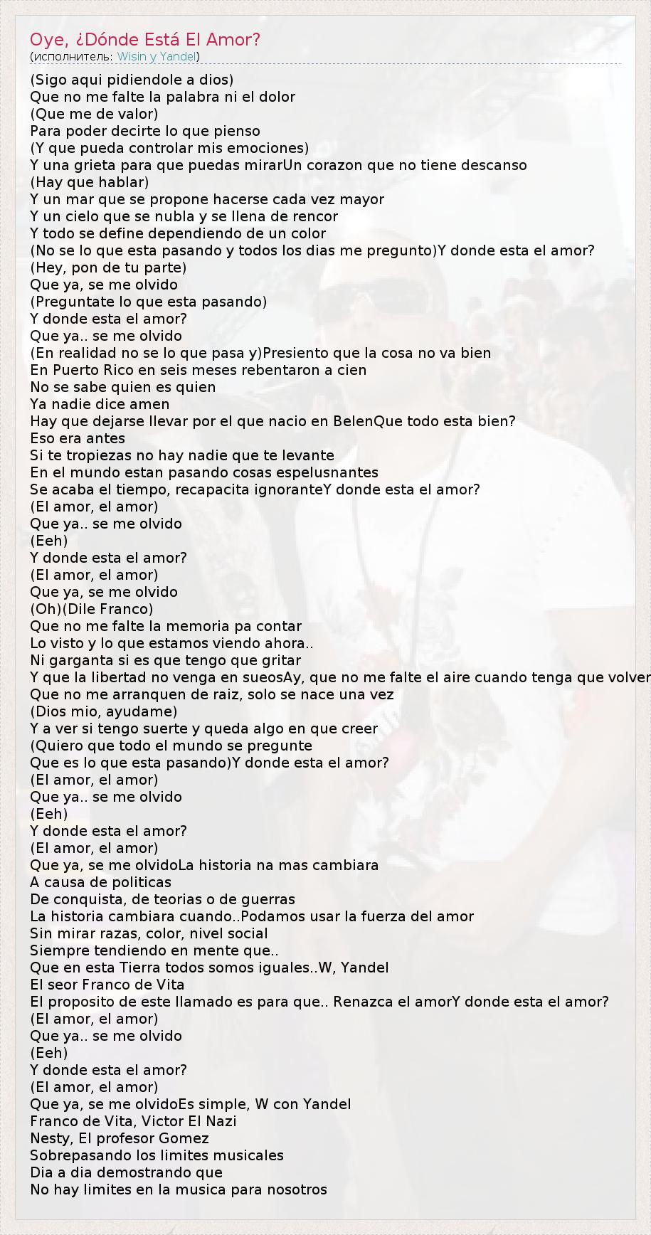 (Sigo aqui pidiendole a dios) Que no me falte la palabra ni el dolor (Que me de valor) Para poder decirte lo que pienso (Y que pueda controlar mis emociones) Y una grieta para que puedas mirarUn corazon que no tiene descanso (Hay que hablar) Y un mar que se propone hacerse cada vez mayor Y un cielo que se nubla y se llena de rencor Y todo se define dependiendo de un color (No se lo que esta pasando y todos los dias me pregunto)Y donde esta el amor? (Hey, pon de tu parte) Que ya, se me olvido (Preguntate lo que esta pasando) Y donde esta el amor? Que ya.. se me olvido (En realidad no se lo que pasa y)Presiento que la cosa no va bien En Puerto Rico en seis meses rebentaron a cien No se sabe quien es quien Ya nadie dice amen Hay que dejarse llevar por el que nacio en BelenQue todo esta bien? Eso era antes Si te tropiezas no hay nadie que te levante En el mundo estan pasando cosas espelusnantes Se acaba el tiempo, recapacita ignoranteY donde esta el amor? (El amor, el amor) Que ya.. se me olvido (Eeh) Y donde esta el amor? (El amor, el amor) Que ya, se me olvido (Oh)(Dile Franco) Que no me falte la memoria pa contar Lo visto y lo que estamos viendo ahora.. Ni garganta si es que tengo que gritar Y que la libertad no venga en sueosAy, que no me falte el aire cuando tenga que volver Que no me arranquen de raiz, solo se nace una vez (Dios mio, ayudame) Y a ver si tengo suerte y queda algo en que creer (Quiero que todo el mundo se pregunte Que es lo que esta pasando)Y donde esta el amor? (El amor, el amor) Que ya.. se me olvido (Eeh) Y donde esta el amor? (El amor, el amor) Que ya, se me olvidoLa historia na mas cambiara A causa de politicas De conquista, de teorias o de guerras La historia cambiara cuando..Podamos usar la fuerza del amor Sin mirar razas, color, nivel social Siempre tendiendo en mente que.. Que en esta Tierra todos somos iguales..W, Yandel El seor Franco de Vita El proposito de este llamado es para que.. Renazca el amorY donde esta el amor? (El amor, el amor) Que ya.. se me olvido (Eeh) Y donde esta el amor? (El amor, el amor) Que ya, se me olvidoEs simple, W con Yandel Franco de Vita, Victor El Nazi Nesty, El profesor Gomez Sobrepasando los limites musicales Dia a dia demostrando que No hay limites en la musica para nosotros