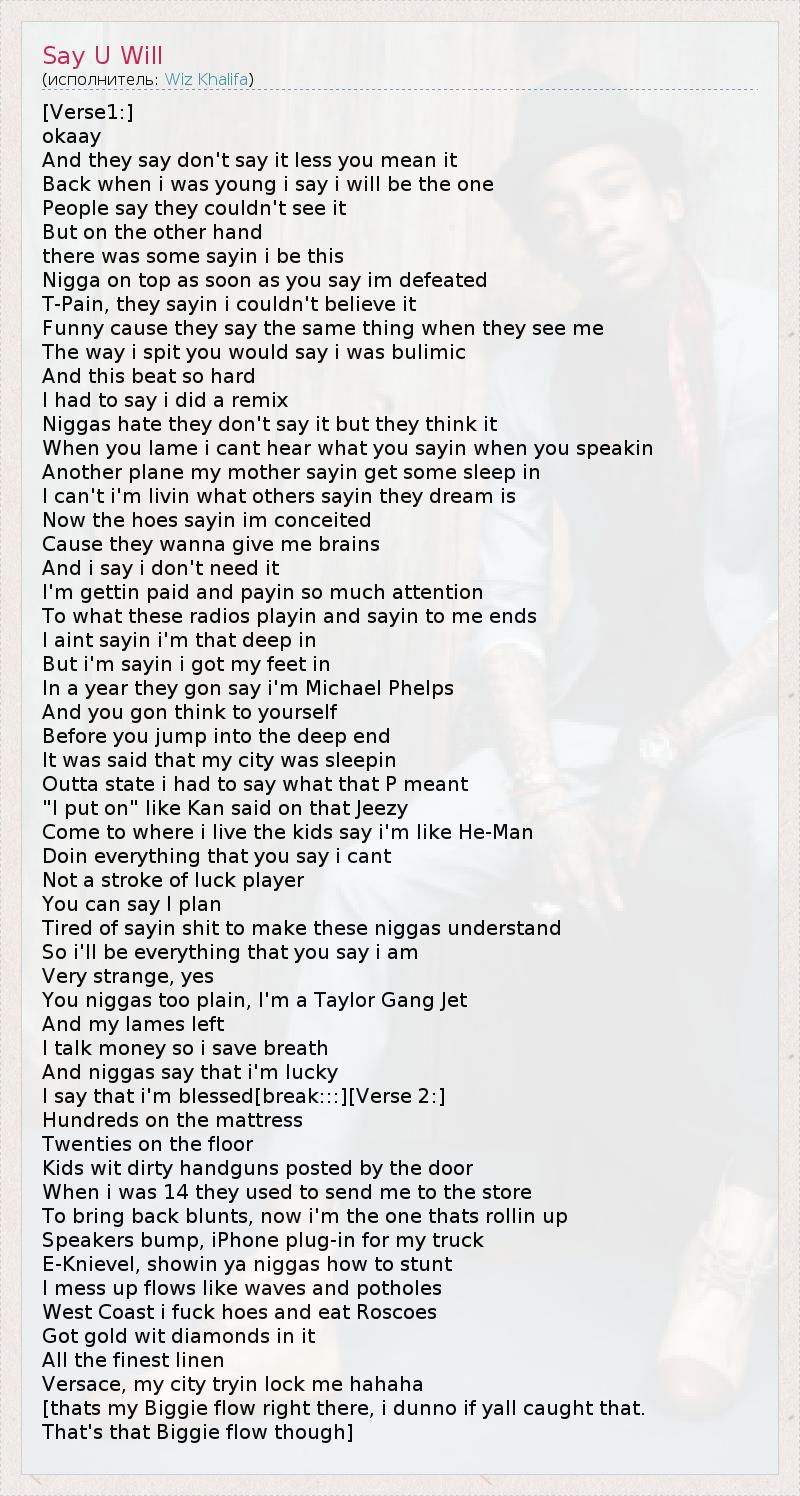 [Verse1:] okaay And they say don't say it less you mean it Back when i was young i say i will be the one People say they couldn't see it But on the other hand there was some sayin i be this Nigga on top as soon as you say im defeated T-Pain, they sayin i couldn't believe it Funny cause they say the same thing when they see me The way i spit you would say i was bulimic And this beat so hard I had to say i did a remix Niggas hate they don't say it but they think it When you lame i cant hear what you sayin when you speakin Another plane my mother sayin get some sleep in I can't i'm livin what others sayin they dream is Now the hoes sayin im conceited Cause they wanna give me brains And i say i don't need it I'm gettin paid and payin so much attention To what these radios playin and sayin to me ends I aint sayin i'm that deep in But i'm sayin i got my feet in In a year they gon say i'm Michael Phelps And you gon think to yourself Before you jump into the deep end It was said that my city was sleepin Outta state i had to say what that P meant "I put on" like Kan said on that Jeezy Come to where i live the kids say i'm like He-Man Doin everything that you say i cant Not a stroke of luck player You can say I plan Tired of sayin shit to make these niggas understand So i'll be everything that you say i am Very strange, yes You niggas too plain, I'm a Taylor Gang Jet And my lames left I talk money so i save breath And niggas say that i'm lucky I say that i'm blessed[break:::][Verse 2:] Hundreds on the mattress Twenties on the floor Kids wit dirty handguns posted by the door When i was 14 they used to send me to the store To bring back blunts, now i'm the one thats rollin up Speakers bump, iPhone plug-in for my truck E-Knievel, showin ya niggas how to stunt I mess up flows like waves and potholes West Coast i fuck hoes and eat Roscoes Got gold wit diamonds in it All the finest linen Versace, my city tryin lock me hahaha [thats my Biggie flow right there, i dunno if yall caught that. That's that Biggie flow though]
