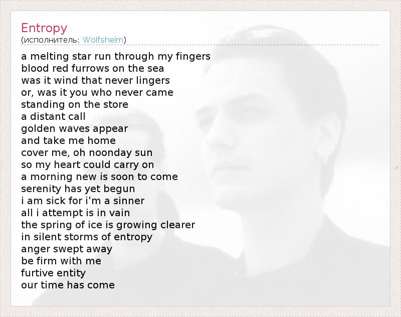 a melting star run through my fingers blood red furrows on the sea was it wind that never lingers or, was it you who never came standing on the store a distant call golden waves appear and take me home cover me, oh noonday sun so my heart could carry on a morning new is soon to come serenity has yet begun i am sick for i'm a sinner all i attempt is in vain the spring of ice is growing clearer in silent storms of entropy anger swept away be firm with me furtive entity our time has come