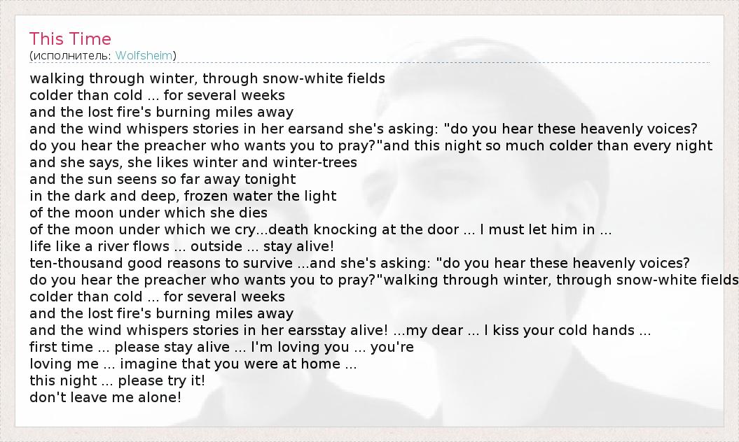 Это интересно:Все началось в 1987-м, когда Маркус Реинхардт и Помпеджо Риччиарди собрали группу и назвали ее Wolfsheim. Вопреки распространенному мнению название Wolfsheim не было основано на имени немецкого города, а по признанию самих музыкантов, восходит к одноименному персонажу, созданному Скоттом Фитжеральдом в романе "Великий Гэтсби" ("The Great Gatsby"). Дуэт превратился в трио, когда брат Маркуса Оливер... продолжение