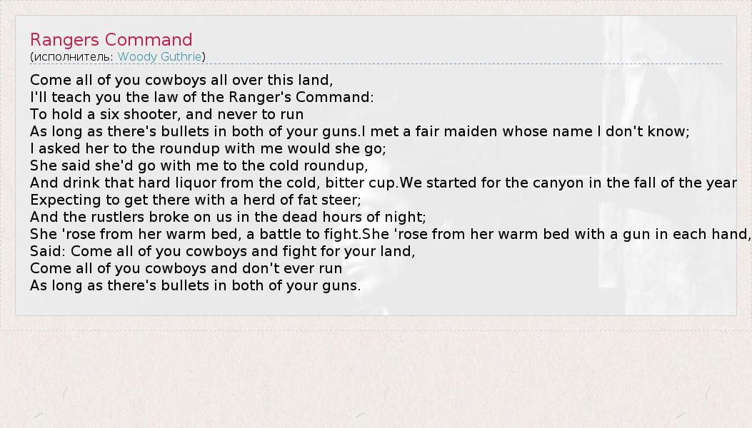 А как ты думаешь, о чем песня "Rangers Command" ?