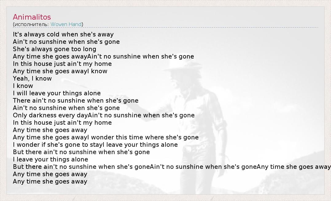 But there ain't no sunshine when she's goneAin't no sunshine when she's goneAny time she goes away