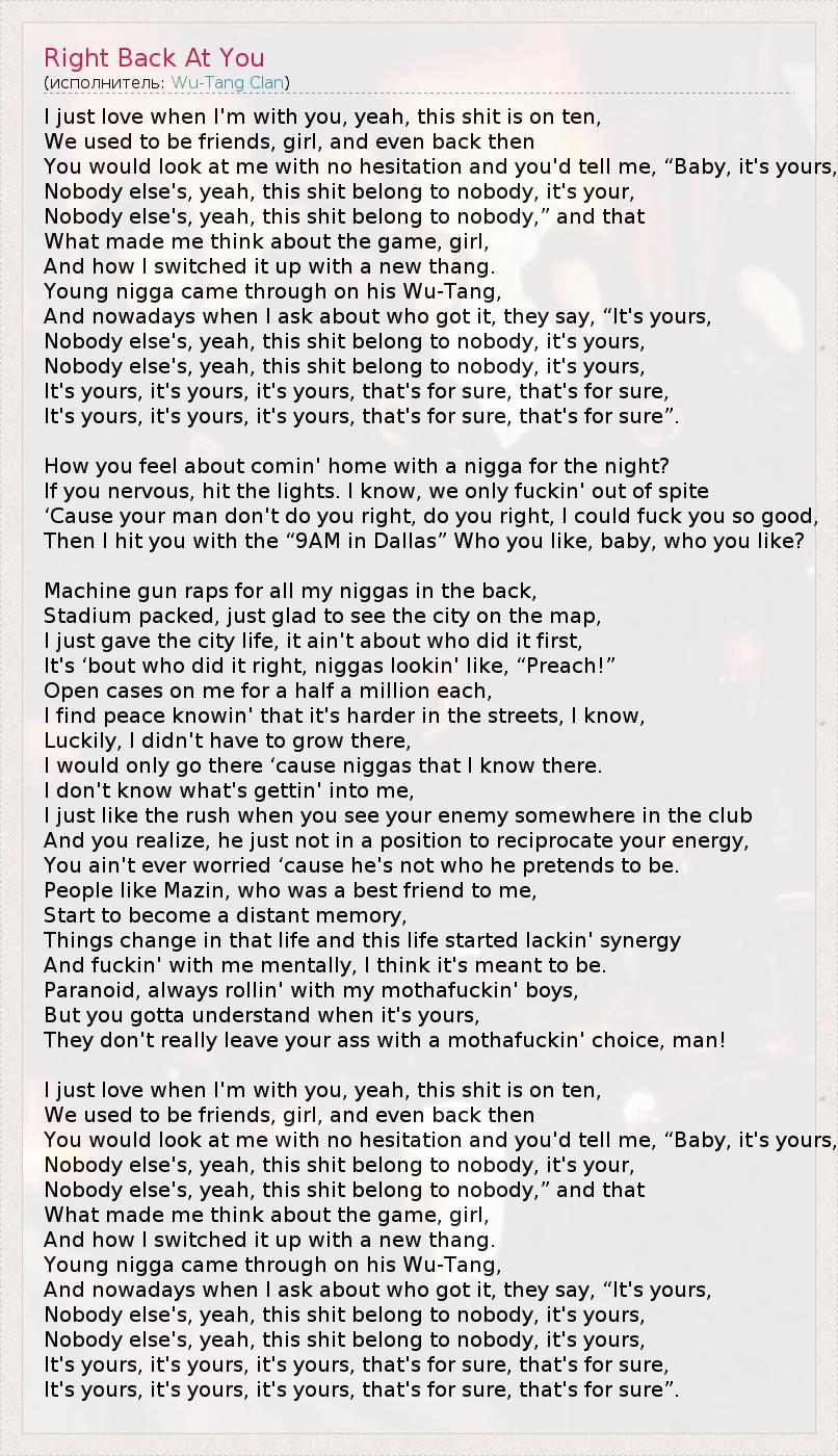I just love when I'm with you, yeah, this shit is on ten, We used to be friends, girl, and even back then You would look at me with no hesitation and you'd tell me, “Baby, it's yours, Nobody else's, yeah, this shit belong to nobody, it's your, Nobody else's, yeah, this shit belong to nobody,” and that What made me think about the game, girl, And how I switched it up with a new thang. Young nigga came through on his Wu-Tang, And nowadays when I ask about who got it, they say, “It's yours, Nobody else's, yeah, this shit belong to nobody, it's yours, Nobody else's, yeah, this shit belong to nobody, it's yours, It's yours, it's yours, it's yours, that's for sure, that's for sure, It's yours, it's yours, it's yours, that's for sure, that's for sure”. How you feel about comin' home with a nigga for the night? If you nervous, hit the lights. I know, we only fuckin' out of spite ‘Cause your man don't do you right, do you right, I could fuck you so good, Then I hit you with the “9AM in Dallas” Who you like, baby, who you like? Machine gun raps for all my niggas in the back, Stadium packed, just glad to see the city on the map, I just gave the city life, it ain't about who did it first, It's ‘bout who did it right, niggas lookin' like, “Preach!” Open cases on me for a half a million each, I find peace knowin' that it's harder in the streets, I know, Luckily, I didn't have to grow there, I would only go there ‘cause niggas that I know there. I don't know what's gettin' into me, I just like the rush when you see your enemy somewhere in the club And you realize, he just not in a position to reciprocate your energy, You ain't ever worried ‘cause he's not who he pretends to be. People like Mazin, who was a best friend to me, Start to become a distant memory, Things change in that life and this life started lackin' synergy And fuckin' with me mentally, I think it's meant to be. Paranoid, always rollin' with my mothafuckin' boys, But you gotta understand when it's yours, They don't really leave your ass with a mothafuckin' choice, man! I just love when I'm with you, yeah, this shit is on ten, We used to be friends, girl, and even back then You would look at me with no hesitation and you'd tell me, “Baby, it's yours, Nobody else's, yeah, this shit belong to nobody, it's your, Nobody else's, yeah, this shit belong to nobody,” and that What made me think about the game, girl, And how I switched it up with a new thang. Young nigga came through on his Wu-Tang, And nowadays when I ask about who got it, they say, “It's yours, Nobody else's, yeah, this shit belong to nobody, it's yours, Nobody else's, yeah, this shit belong to nobody, it's yours, It's yours, it's yours, it's yours, that's for sure, that's for sure, It's yours, it's yours, it's yours, that's for sure, that's for sure”.