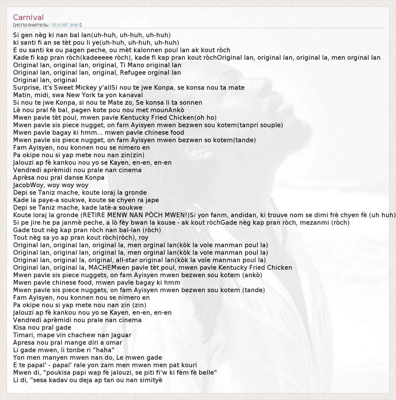 Это интересно:Нелуст Вайклеф Джaн родился 17 октября 1969 года в Круа-де-Буке на Гаити. Когда ему исполнилось 9 лет, он с семьёй переехал в Нью-Йорк, а затем в Нью-Джерси, где он начал играть на гитаре и изучать джаз.В 1987 году Вайклеф, его двоюродный брат Праказрел Мишел (Prakazrel Michel, Pras) и его одноклассница Лорин Хилл (Lauryn Hill) создают хип-хоп-группу The... продолжение