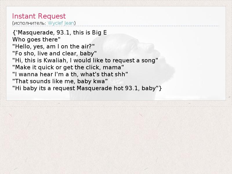 "Hi baby its a request Masquerade hot 93.1, baby"}