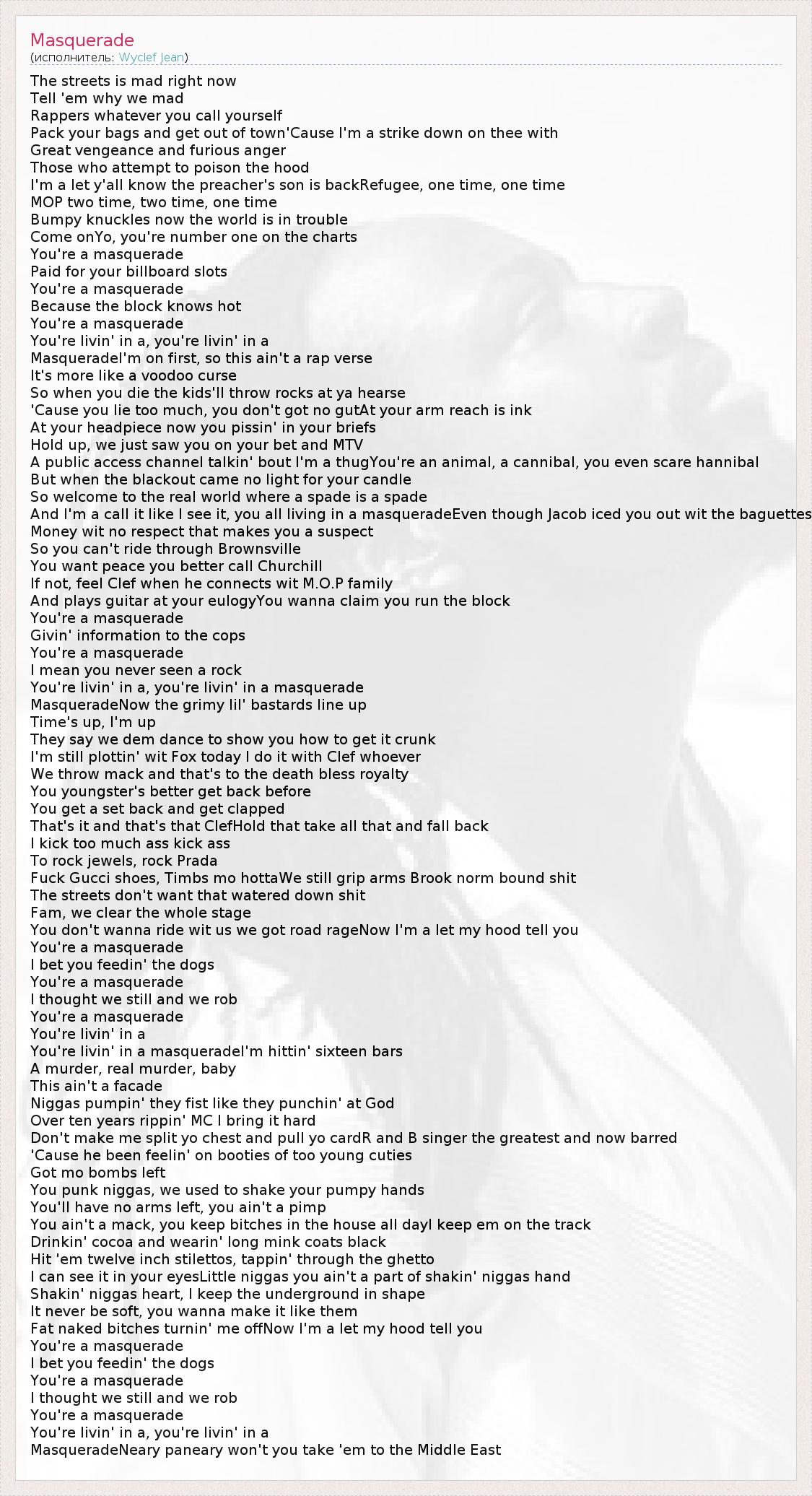 The streets is mad right now Tell 'em why we mad Rappers whatever you call yourself Pack your bags and get out of town'Cause I'm a strike down on thee with Great vengeance and furious anger Those who attempt to poison the hood I'm a let y'all know the preacher's son is backRefugee, one time, one time MOP two time, two time, one time Bumpy knuckles now the world is in trouble Come onYo, you're number one on the charts You're a masquerade Paid for your billboard slots You're a masquerade Because the block knows hot You're a masquerade You're livin' in a, you're livin' in a MasqueradeI'm on first, so this ain't a rap verse It's more like a voodoo curse So when you die the kids'll throw rocks at ya hearse 'Cause you lie too much, you don't got no gutAt your arm reach is ink At your headpiece now you pissin' in your briefs Hold up, we just saw you on your bet and MTV A public access channel talkin' bout I'm a thugYou're an animal, a cannibal, you even scare hannibal But when the blackout came no light for your candle So welcome to the real world where a spade is a spade And I'm a call it like I see it, you all living in a masqueradeEven though Jacob iced you out wit the baguettes Money wit no respect that makes you a suspect So you can't ride through Brownsville You want peace you better call Churchill If not, feel Clef when he connects wit M.O.P family And plays guitar at your eulogyYou wanna claim you run the block You're a masquerade Givin' information to the cops You're a masquerade I mean you never seen a rock You're livin' in a, you're livin' in a masquerade MasqueradeNow the grimy lil' bastards line up Time's up, I'm up They say we dem dance to show you how to get it crunk I'm still plottin' wit Fox today I do it with Clef whoever We throw mack and that's to the death bless royalty You youngster's better get back before You get a set back and get clapped That's it and that's that ClefHold that take all that and fall back I kick too much ass kick ass To rock jewels, rock Prada Fuck Gucci shoes, Timbs mo hottaWe still grip arms Brook norm bound shit The streets don't want that watered down shit Fam, we clear the whole stage You don't wanna ride wit us we got road rageNow I'm a let my hood tell you You're a masquerade I bet you feedin' the dogs You're a masquerade I thought we still and we rob You're a masquerade You're livin' in a You're livin' in a masqueradeI'm hittin' sixteen bars A murder, real murder, baby This ain't a facade Niggas pumpin' they fist like they punchin' at God Over ten years rippin' MC I bring it hard Don't make me split yo chest and pull yo cardR and B singer the greatest and now barred 'Cause he been feelin' on booties of too young cuties Got mo bombs left You punk niggas, we used to shake your pumpy hands You'll have no arms left, you ain't a pimp You ain't a mack, you keep bitches in the house all dayI keep em on the track Drinkin' cocoa and wearin' long mink coats black Hit 'em twelve inch stilettos, tappin' through the ghetto I can see it in your eyesLittle niggas you ain't a part of shakin' niggas hand Shakin' niggas heart, I keep the underground in shape It never be soft, you wanna make it like them Fat naked bitches turnin' me offNow I'm a let my hood tell you You're a masquerade I bet you feedin' the dogs You're a masquerade I thought we still and we rob You're a masquerade You're livin' in a, you're livin' in a MasqueradeNeary paneary won't you take 'em to the Middle East