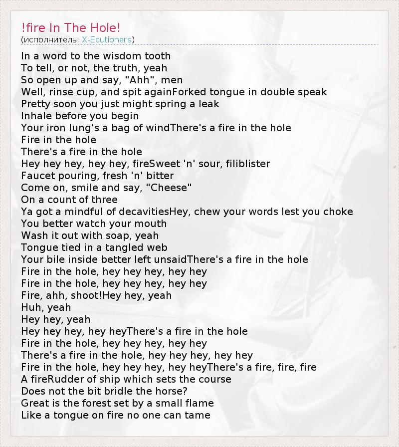 In a word to the wisdom tooth To tell, or not, the truth, yeah So open up and say, "Ahh", men Well, rinse cup, and spit againForked tongue in double speak Pretty soon you just might spring a leak Inhale before you begin Your iron lung's a bag of windThere's a fire in the hole Fire in the hole There's a fire in the hole Hey hey hey, hey hey, fireSweet 'n' sour, filiblister Faucet pouring, fresh 'n' bitter Come on, smile and say, "Cheese" On a count of three Ya got a mindful of decavitiesHey, chew your words lest you choke You better watch your mouth Wash it out with soap, yeah Tongue tied in a tangled web Your bile inside better left unsaidThere's a fire in the hole Fire in the hole, hey hey hey, hey hey Fire in the hole, hey hey hey, hey hey Fire, ahh, shoot!Hey hey, yeah Huh, yeah Hey hey, yeah Hey hey hey, hey heyThere's a fire in the hole Fire in the hole, hey hey hey, hey hey There's a fire in the hole, hey hey hey, hey hey Fire in the hole, hey hey hey, hey heyThere's a fire, fire, fire A fireRudder of ship which sets the course Does not the bit bridle the horse? Great is the forest set by a small flame Like a tongue on fire no one can tame