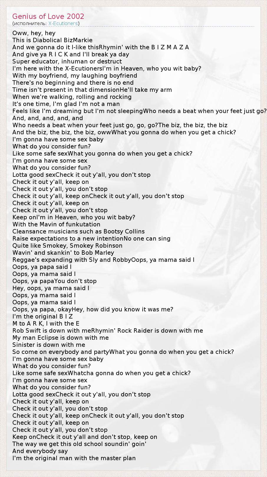 А как ты думаешь, о чем песня "Genius of Love 2002" ?