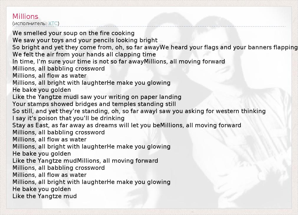 Это интересно:p>XTC — британская рок-группа, образовавшаяся в 1976 году в Суиндоне, Англия, ставшая важной частью новой волны и исполнявшая альтернативный арт-рок с элементами панк-рока, фолк-прога, психоделии и авангарда. В чем-то созвучный американским нововолновым новаторам (Pere Ubu и Talking Heads), но отчасти продолживший и английские традиции рок-эксцентрики (Pink Floyd, The Kinks, Family), ансамбль прошел по…... продолжение
