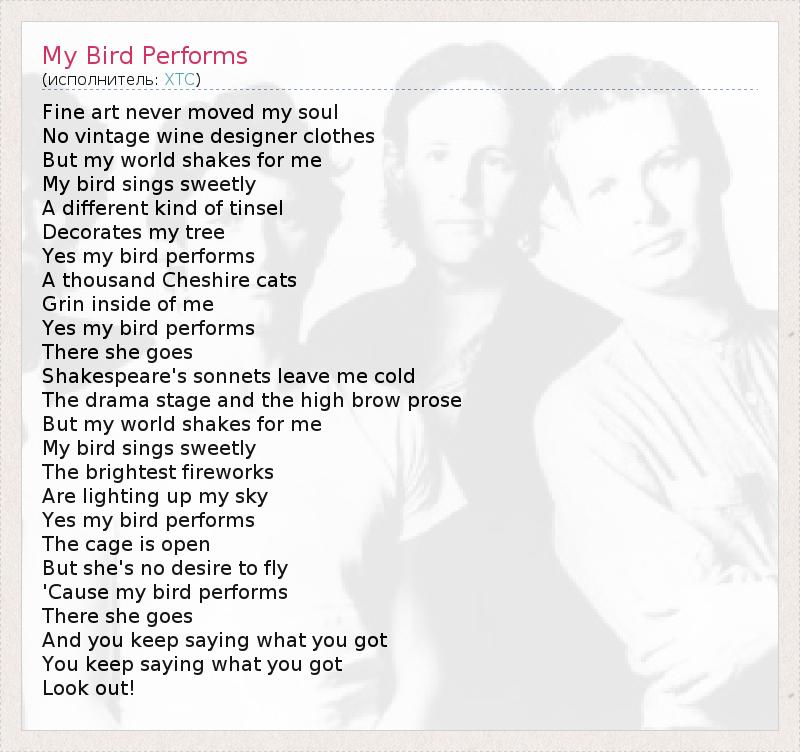 Fine art never moved my soul No vintage wine designer clothes But my world shakes for me My bird sings sweetly A different kind of tinsel Decorates my tree Yes my bird performs A thousand Cheshire cats Grin inside of me Yes my bird performs There she goes Shakespeare's sonnets leave me cold The drama stage and the high brow prose But my world shakes for me My bird sings sweetly The brightest fireworks Are lighting up my sky Yes my bird performs The cage is open But she's no desire to fly 'Cause my bird performs There she goes And you keep saying what you got You keep saying what you got Look out!