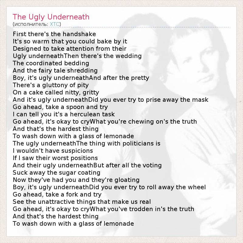 First there's the handshake It's so warm that you could bake by it Designed to take attention from their Ugly underneathThen there's the wedding The coordinated bedding And the fairy tale shredding Boy, it's ugly underneathAnd after the pretty There's a gluttony of pity On a cake called nitty, gritty And it's ugly underneathDid you ever try to prise away the mask Go ahead, take a spoon and try I can tell you it's a herculean task Go ahead, it's okay to cryWhat you're chewing on's the truth And that's the hardest thing To wash down with a glass of lemonade The ugly underneathThe thing with politicians is I wouldn't have suspicions If I saw their worst positions And their ugly underneathBut after all the voting Suck away the sugar coating Now they've had you and they're gloating Boy, it's ugly underneathDid you ever try to roll away the wheel Go ahead, take a fork and try See the unattractive things that make us real Go ahead, it's okay to cryWhat you've trodden in's the truth And that's the hardest thing To wash down with a glass of lemonade