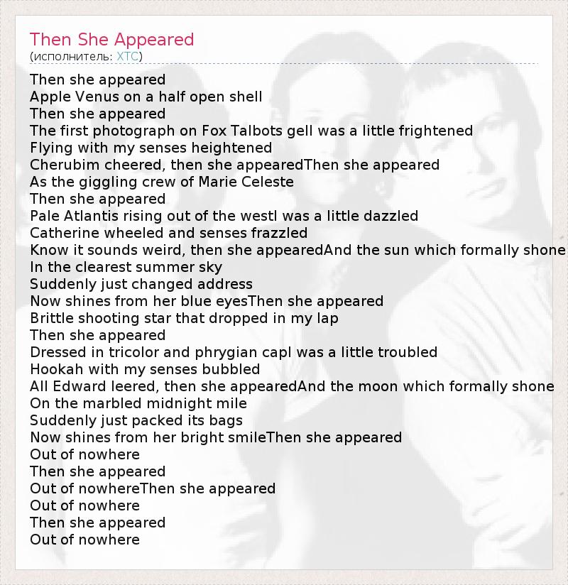 Then she appeared Apple Venus on a half open shell Then she appeared The first photograph on Fox Talbots gelI was a little frightened Flying with my senses heightened Cherubim cheered, then she appearedThen she appeared As the giggling crew of Marie Celeste Then she appeared Pale Atlantis rising out of the westI was a little dazzled Catherine wheeled and senses frazzled Know it sounds weird, then she appearedAnd the sun which formally shone In the clearest summer sky Suddenly just changed address Now shines from her blue eyesThen she appeared Brittle shooting star that dropped in my lap Then she appeared Dressed in tricolor and phrygian capI was a little troubled Hookah with my senses bubbled All Edward leered, then she appearedAnd the moon which formally shone On the marbled midnight mile Suddenly just packed its bags Now shines from her bright smileThen she appeared Out of nowhere Then she appeared Out of nowhereThen she appeared Out of nowhere Then she appeared Out of nowhere