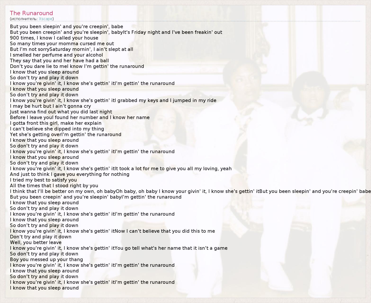 But you been sleepin' and you're creepin', babe But you been creepin' and you're sleepin', babyIt's Friday night and I've been freakin' out 900 times, I know I called your house So many times your momma cursed me out But I'm not sorrySaturday mornin', I ain't slept at all I smelled her perfume and your alcohol They say that you and her have had a ball Don't you dare lie to meI know I'm gettin' the runaround I know that you sleep around So don't try and play it down I know you're givin' it, I know she's gettin' itI'm gettin' the runaround I know that you sleep around So don't try and play it down I know you're givin' it, I know she's gettin' itI grabbed my keys and I jumped in my ride I may be hurt but I ain't gonna cry Just wanna find out what you did last night Before I leave youI found her number and I know her name I gotta front this girl, make her explain I can't believe she dipped into my thing Yet she's getting overI'm gettin' the runaround I know that you sleep around So don't try and play it down I know you're givin' it, I know she's gettin' itI'm gettin' the runaround I know that you sleep around So don't try and play it down I know you're givin' it, I know she's gettin' itIt took a lot for me to give you all my loving, yeah And just to think I gave you everything for nothing I tried my best to satisfy you All the times that I stood right by you I think that I'll be better on my own, oh babyOh baby, oh baby I know your givin' it, I know she's gettin' itBut you been sleepin' and you're creepin' babe But you been creepin' and you're sleepin' babyI'm gettin' the runaround I know that you sleep around So don't try and play it down I know you're givin' it, I know she's gettin' itI'm gettin' the runaround I know that you sleep around So don't try and play it down I know you're givin' it, I know she's gettin' itNow I can't believe that you did this to me Don't try and play it down Well, you better leave I know you're givin' it, I know she's gettin' itYou go tell what's her name that it isn't a game So don't try and play it down Boy you messed up your thang I know you're givin' it, I know she's gettin' itI'm gettin' the runaround I know that you sleep around So don't try and play it down I know you're givin' it, I know she's gettin' itI'm gettin' the runaround I know that you sleep around