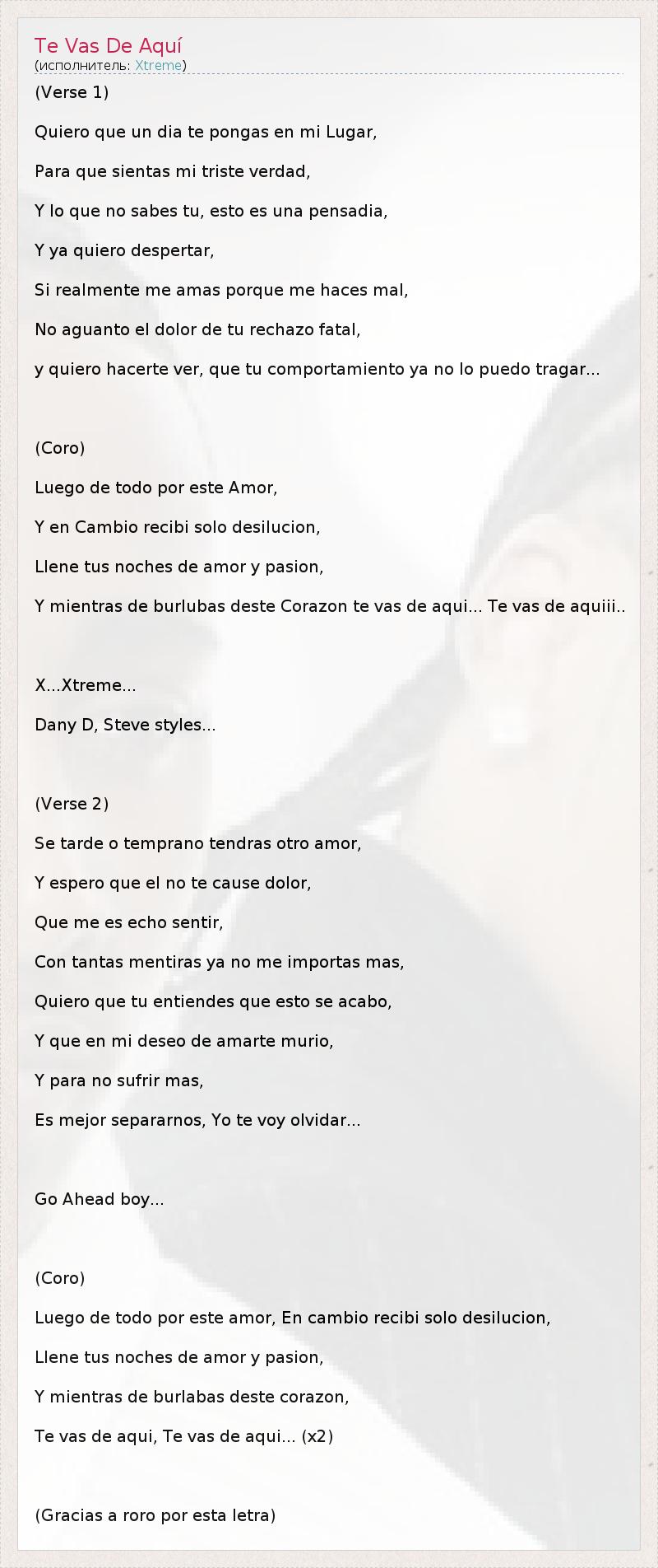 (Verse 1) Quiero que un dia te pongas en mi Lugar, Para que sientas mi triste verdad, Y lo que no sabes tu, esto es una pensadia, Y ya quiero despertar, Si realmente me amas porque me haces mal, No aguanto el dolor de tu rechazo fatal, y quiero hacerte ver, que tu comportamiento ya no lo puedo tragar... (Coro) Luego de todo por este Amor, Y en Cambio recibi solo desilucion, Llene tus noches de amor y pasion, Y mientras de burlubas deste Corazon te vas de aqui... Te vas de aquiii.. X...Xtreme... Dany D, Steve styles... (Verse 2) Se tarde o temprano tendras otro amor, Y espero que el no te cause dolor, Que me es echo sentir, Con tantas mentiras ya no me importas mas, Quiero que tu entiendes que esto se acabo, Y que en mi deseo de amarte murio, Y para no sufrir mas, Es mejor separarnos, Yo te voy olvidar... Go Ahead boy... (Coro) Luego de todo por este amor, En cambio recibi solo desilucion, Llene tus noches de amor y pasion, Y mientras de burlabas deste corazon, Te vas de aqui, Te vas de aqui... (x2) (Gracias a roro por esta letra)