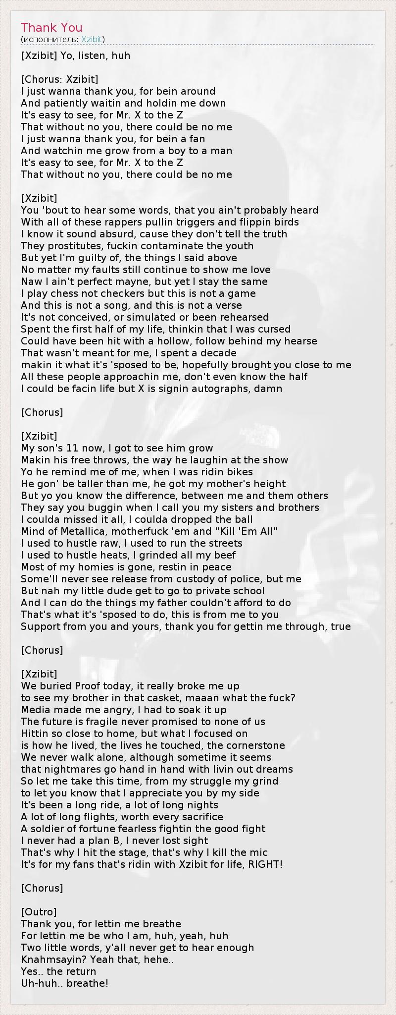 [Xzibit] Эй, слушай, да [Припев: Xzibit] Я просто хочу поблагодарить вас, потому что вокруг Бейн И терпеливо Waitin и Holdin меня Легко видеть, для г-на Х на Z Что без тебя нет, не могло быть и мне Я просто хочу поблагодарить вас, за Бейн вентилятора И Watchin мне вырасти из мальчика в мужчину Легко видеть, для г-на Х на Z Что без тебя нет, не могло быть и мне [Xzibit] Вы бой услышать какие-то слова, что вы не слышали, вероятно, С учетом всех этих рэперов втягивание триггеров и Flippin птиц Я знаю, это звучит абсурдно, потому что они не говорят правды Они проститутки, блядь загрязнять молодежи Но все же я виновен, то, что я сказал выше Независимо от того, мои недостатки до сих пор продолжают покажи мне любовь Нау я не совершенен Мейна, но все же я остаюсь тем же Я не играю в шахматы шашки, но это не игра И это не песня, а это не стих Это не задумано, или смоделированные или были репетировала Провел первую половину моей жизни, думаешь, что я был проклят Могли бы были поражены с полыми, следуйте за моей катафалк Это не означало для меня, я потратил десятилетия Макин это то, что он 'sposed быть, мы надеемся, принес вам близко от меня Все эти люди approachin меня, даже не знаю, половина Я мог бы быть facin жизни, но Х зарегистрировались автографы, черт [Chorus] [Xzibit] Мой сын 11 сейчас, я добрался, чтобы видеть ему расти Макин его штрафные броски, как он laughin на выставке Йо, он напоминает мне меня, когда я был Ridin велосипеды Он собираешься быть выше меня, он получил высоты моей матери Но лет вы знаете разницу между Мною и между ними другие Говорят, вы buggin, когда я звоню вам мои сестры и братья Я coulda пропустил все это, я coulda упал мяч Разум Metallica, motherfuck их и "Kill 'Em All" Раньше я суеты сырой, я бегал улиц Раньше я суеты нагревается, я измельченных все мои говядины Большинство моих корешей нет, restin в мире Some'll никогда не видят освобождение из-под стражи полиции, но меня Но нах мой маленький чувак получить идти в частную школу И я могу делать то, что мой отец не мог позволить себе сделать Это то, что он 'sposed сделать, это от меня к вам Поддержка от вас и вашего, благодарим вас за мной через получаешь, правда [Chorus] [Xzibit] Мы похоронили Доказательство сегодня, это действительно сломал меня к брату в этой шкатулке, maaan что ебешь? СМИ заставили меня сердит, я должен был впитать его Будущее хрупкой никогда не обещал ни один из нас Hittin так близко к дому, но что я сосредоточился на Вот как он жил, он коснулся жизни, краеугольным камнем Мы никогда не ходить в одиночку, хотя иногда кажется, кошмары, что идут рука об руку с Livin из мечты Итак, позвольте мне взять на сей раз, с моей борьбы моей молоть чтобы вы знали, что я ценю Вас на моей стороне Это была длинная поездка, много долгих ночей Много долгих перелетов, стоит каждого жертвы Солдат удачи бесстрашный Fightin хороший бой Я никогда не был план B, я никогда не терял из виду Вот почему я попал в этап, поэтому я убью микрофон Это для моих поклонников это Ridin с Xzibit на всю жизнь, право! [Chorus] [Outro] Спасибо, за Lettin мне дышать Для Lettin мне быть, кто я, да, да, да Два коротких слова, y'all никогда не слышать достаточно Knahmsayin? Да, это, хе-хе .. Да .. возвращение Угу .. дышать!