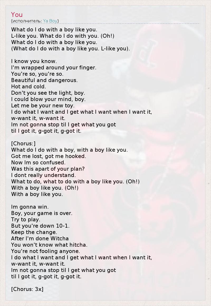 What do I do with a boy like you. L-like you. What do I do with you. (Oh!) What do I do with a boy like you. (What do I do with a boy like you. L-like you). I know you know. I'm wrapped around your finger. You're so, you're so. Beautiful and dangerous. Hot and cold. Don't you see the light, boy. I could blow your mind, boy. Let me be your new toy. I do what I want and I get what I want when I want it, w-want it, w-want it. Im not gonna stop til I get what you got til I got it, g-got it, g-got it. [Chorus:] What do I do with a boy, with a boy like you. Got me lost, got me hooked. Now Im so confused. Was this apart of your plan? I dont really understand. What to do, what to do with a boy like you. (Oh!) With a boy like you. (Oh!) With a boy like you. Im gonna win. Boy, your game is over. Try to play. But you're down 10-1. Keep the change. After I'm done Witcha You won't know what hitcha. You're not fooling anyone. I do what I want and I get what I want when I want it, w-want it, w-want it. Im not gonna stop til I get what you got til I got it, g-got it, g-got it. [Chorus: 3x]