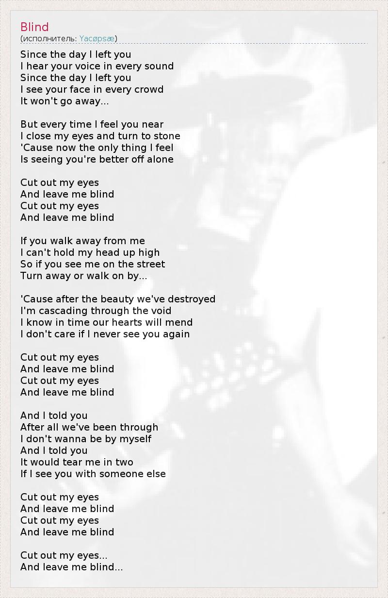 С того дня, как я покинул тебя, Я слышу твой голос в каждом звуке. С того дня, как я покинул тебя, Я вижу твоё лицо всюду толпе. И это не пройдёт... Но каждый раз, когда я чувствую тебя рядом, Я закрываю глаза и превращаюсь в камень, Потому что единственное, что я теперь чувствую - Понимание того, что тебе лучше одной. Вырежи мои глаза И оставь меня слепым, Вырежи мои глаза И оставь меня слепым... Если ты уйдешь от меня, Я не смогу остаться с высоко поднятой головой. Поэтому если ты увидишь меня на улице, Отворачивайся или проходи мимо... После того прекрасного, что мы разрушили, Я низвергаюсь в пустоту. Я знаю, со временем наши сердца заживут, И меня не волнует, увижу ли я тебя снова. Вырежи мои глаза И оставь меня слепым, Вырежи мои глаза И оставь меня слепым... Я сказал тебе, Что после всего, что было между нами, Я не хочу остаться один. Я сказал тебе, Что это разорвет меня на части, Если увижу тебя с другим. Вырежи мои глаза И оставь меня слепым, Вырежи мои глаза И оставь меня слепым... Вырежи мои глаза... И оставь меня слепым...