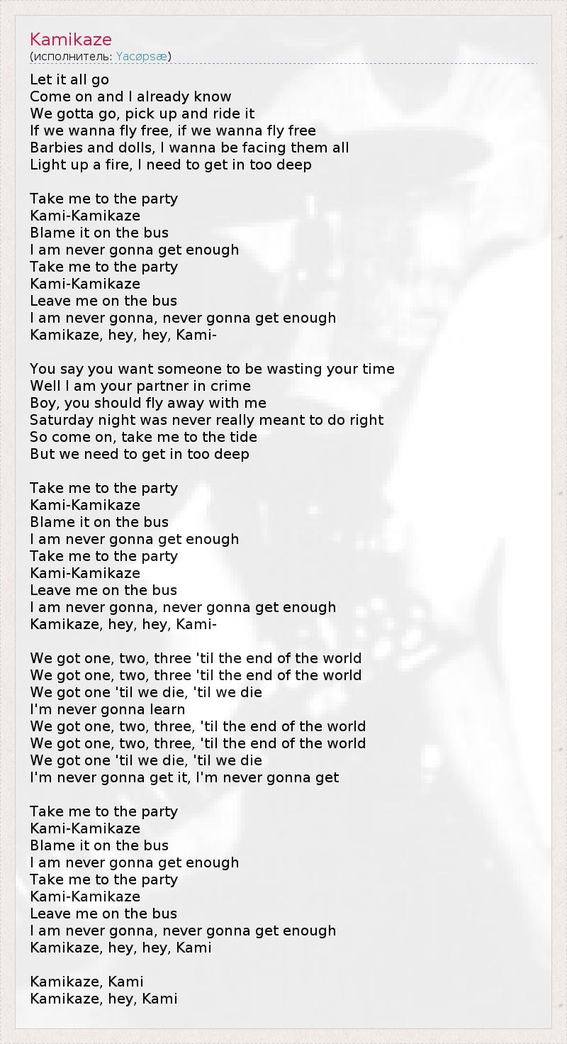 Let it all go Come on and I already know We gotta go, pick up and ride it If we wanna fly free, if we wanna fly free Barbies and dolls, I wanna be facing them all Light up a fire, I need to get in too deep Take me to the party Kami-Kamikaze Blame it on the bus I am never gonna get enough Take me to the party Kami-Kamikaze Leave me on the bus I am never gonna, never gonna get enough Kamikaze, hey, hey, Kami- You say you want someone to be wasting your time Well I am your partner in crime Boy, you should fly away with me Saturday night was never really meant to do right So come on, take me to the tide But we need to get in too deep Take me to the party Kami-Kamikaze Blame it on the bus I am never gonna get enough Take me to the party Kami-Kamikaze Leave me on the bus I am never gonna, never gonna get enough Kamikaze, hey, hey, Kami- We got one, two, three 'til the end of the world We got one, two, three 'til the end of the world We got one 'til we die, 'til we die I'm never gonna learn We got one, two, three, 'til the end of the world We got one, two, three, 'til the end of the world We got one 'til we die, 'til we die I'm never gonna get it, I'm never gonna get Take me to the party Kami-Kamikaze Blame it on the bus I am never gonna get enough Take me to the party Kami-Kamikaze Leave me on the bus I am never gonna, never gonna get enough Kamikaze, hey, hey, Kami Kamikaze, Kami Kamikaze, hey, Kami