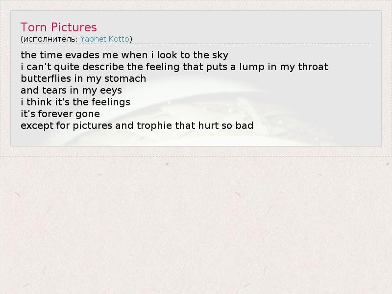 А как ты думаешь, о чем песня "Torn Pictures" ?