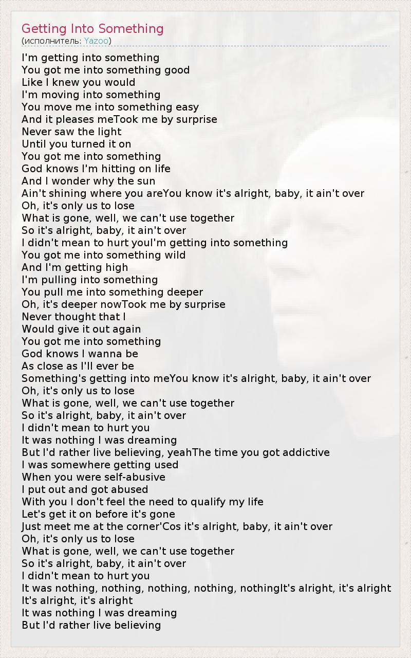 I'm getting into something You got me into something good Like I knew you would I'm moving into something You move me into something easy And it pleases meTook me by surprise Never saw the light Until you turned it on You got me into something God knows I'm hitting on life And I wonder why the sun Ain't shining where you areYou know it's alright, baby, it ain't over Oh, it's only us to lose What is gone, well, we can't use together So it's alright, baby, it ain't over I didn't mean to hurt youI'm getting into something You got me into something wild And I'm getting high I'm pulling into something You pull me into something deeper Oh, it's deeper nowTook me by surprise Never thought that I Would give it out again You got me into something God knows I wanna be As close as I'll ever be Something's getting into meYou know it's alright, baby, it ain't over Oh, it's only us to lose What is gone, well, we can't use together So it's alright, baby, it ain't over I didn't mean to hurt you It was nothing I was dreaming But I'd rather live believing, yeahThe time you got addictive I was somewhere getting used When you were self-abusive I put out and got abused With you I don't feel the need to qualify my life Let's get it on before it's gone Just meet me at the corner'Cos it's alright, baby, it ain't over Oh, it's only us to lose What is gone, well, we can't use together So it's alright, baby, it ain't over I didn't mean to hurt you It was nothing, nothing, nothing, nothing, nothingIt's alright, it's alright It's alright, it's alright It was nothing I was dreaming But I'd rather live believing