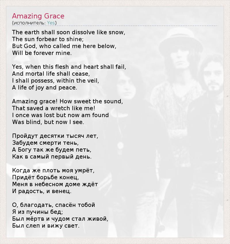 The earth shall soon dissolve like snow, The sun forbear to shine; But God, who called me here below, Will be forever mine. Yes, when this flesh and heart shall fail, And mortal life shall cease, I shall possess, within the veil, A life of joy and peace. Amazing grace! How sweet the sound, That saved a wretch like me! I once was lost but now am found Was blind, but now I see. Пройдут десятки тысяч лет, Забудем смерти тень, А Богу так же будем петь, Как в самый первый день. Когда же плоть моя умрёт, Придёт борьбе конец, Меня в небесном доме ждёт И радость, и венец. О, благодать, спасён тобой Я из пучины бед; Был мёртв и чудом стал живой, Был слеп и вижу свет.