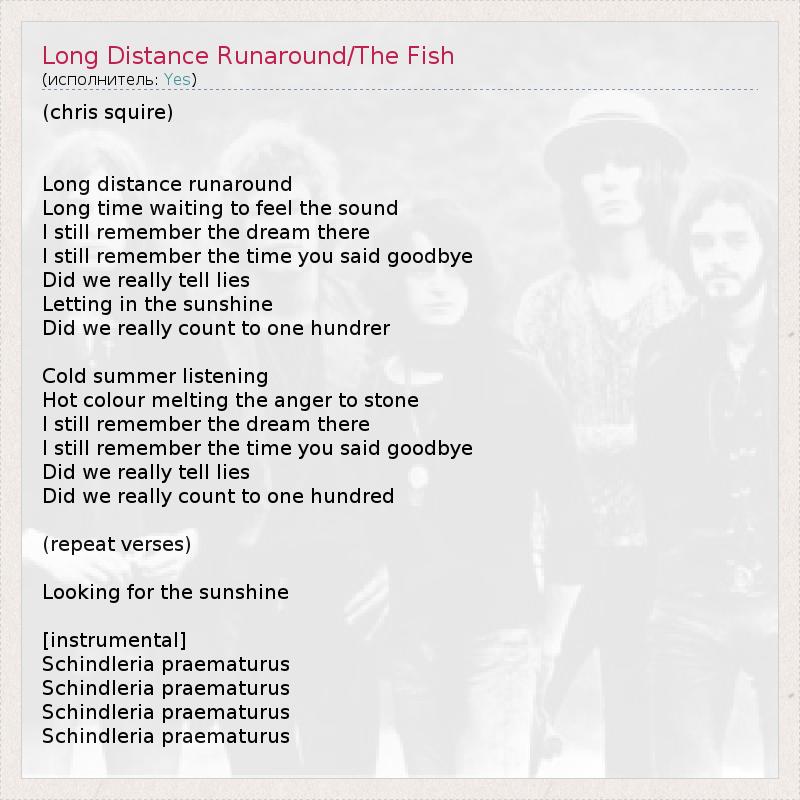 (chris squire) Long distance runaround Long time waiting to feel the sound I still remember the dream there I still remember the time you said goodbye Did we really tell lies Letting in the sunshine Did we really count to one hundrer Cold summer listening Hot colour melting the anger to stone I still remember the dream there I still remember the time you said goodbye Did we really tell lies Did we really count to one hundred (repeat verses) Looking for the sunshine [instrumental] Schindleria praematurus Schindleria praematurus Schindleria praematurus Schindleria praematurus