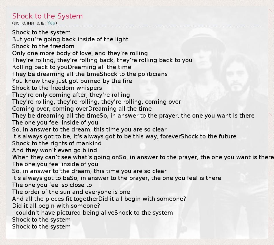 Shock to the system But you're going back inside of the light Shock to the freedom Only one more body of love, and they're rolling They're rolling, they're rolling back, they're rolling back to you Rolling back to youDreaming all the time They be dreaming all the timeShock to the politicians You know they just got burned by the fire Shock to the freedom whispers They're only coming after, they're rolling They're rolling, they're rolling, they're rolling, coming over Coming over, coming overDreaming all the time They be dreaming all the timeSo, in answer to the prayer, the one you want is there The one you feel inside of you So, in answer to the dream, this time you are so clear It's always got to be, it's always got to be this way, foreverShock to the future Shock to the rights of mankind And they won't even go blind When they can't see what's going onSo, in answer to the prayer, the one you want is there The one you feel inside of you So, in answer to the dream, this time you are so clear It's always got to beSo, in answer to the prayer, the one you feel is there The one you feel so close to The order of the sun and everyone is one And all the pieces fit togetherDid it all begin with someone? Did it all begin with someone? I couldn't have pictured being aliveShock to the system Shock to the system Shock to the system