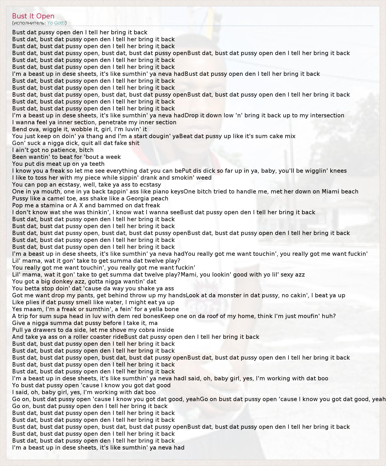 Bust dat, bust dat pussy open, bust dat, bust dat pussy openBust dat, bust dat pussy open den I tell her bring it back