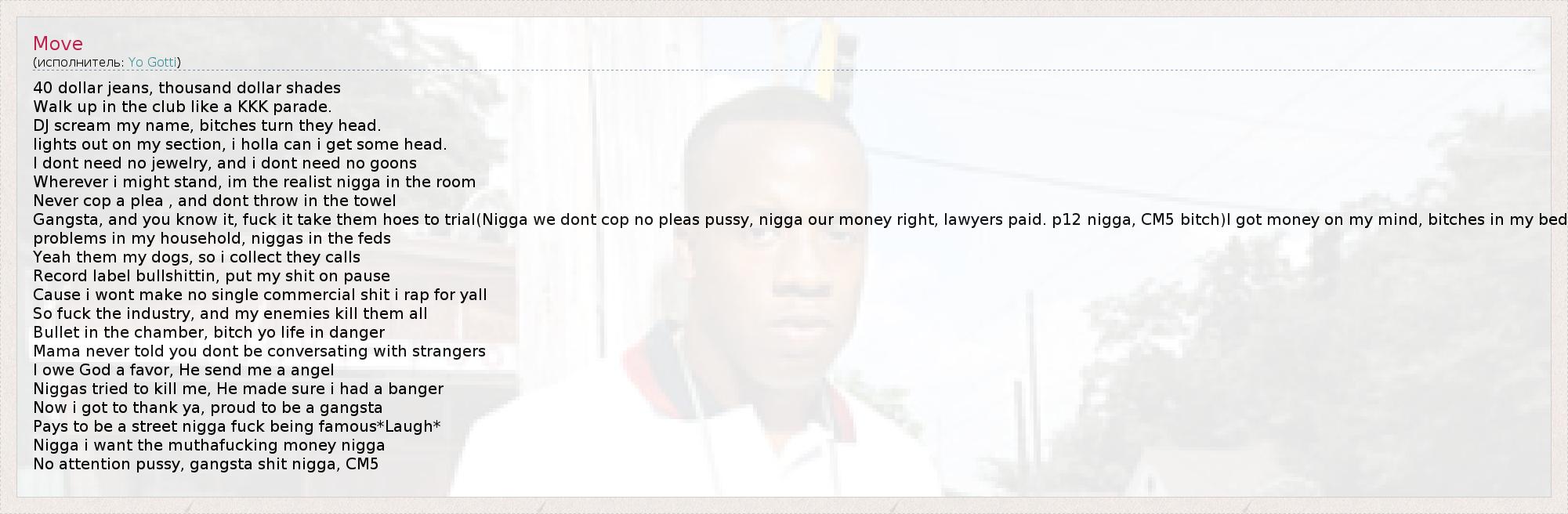 40 dollar jeans, thousand dollar shades Walk up in the club like a KKK parade. DJ scream my name, bitches turn they head. lights out on my section, i holla can i get some head. I dont need no jewelry, and i dont need no goons Wherever i might stand, im the realist nigga in the room Never cop a plea , and dont throw in the towel Gangsta, and you know it, fuck it take them hoes to trial(Nigga we dont cop no pleas pussy, nigga our money right, lawyers paid. p12 nigga, CM5 bitch)I got money on my mind, bitches in my bed problems in my household, niggas in the feds Yeah them my dogs, so i collect they calls Record label bullshittin, put my shit on pause Cause i wont make no single commercial shit i rap for yall So fuck the industry, and my enemies kill them all Bullet in the chamber, bitch yo life in danger Mama never told you dont be conversating with strangers I owe God a favor, He send me a angel Niggas tried to kill me, He made sure i had a banger Now i got to thank ya, proud to be a gangsta Pays to be a street nigga fuck being famous*Laugh* Nigga i want the muthafucking money nigga No attention pussy, gangsta shit nigga, CM5