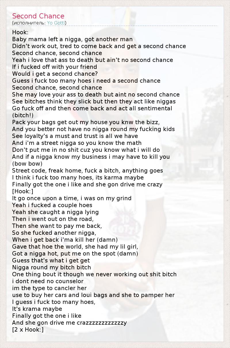 Hook: Baby mama left a nigga, got another man Didn't work out, tred to come back and get a second chance Second chance, second chance Yeah i love that ass to death but ain't no second chance If i fucked off with your friend Would i get a second chance? Guess i fuck too many hoes i need a second chance Second chance, second chance She may love your ass to death but aint no second chance See bitches think they slick but then they act like niggas Go fuck off and then come back and act all sentimental (bitch!) Pack your bags get out my house you knw the bizz, And you better not have no nigga round my fucking kids See loyalty's a must and trust is all we have And i'm a street nigga so you know the math Don't put me in no shit cuz you know what i will do And if a nigga know my business i may have to kill you (bow bow) Street code, freak home, fuck a bitch, anything goes I think i fuck too many hoes, its karma maybe Finally got the one i like and she gon drive me crazy [Hook:] It go once upon a time, i was on my grind Yeah i fucked a couple hoes Yeah she caught a nigga lying Then i went out on the road, Then she want to pay me back, So she fucked another nigga, When i get back i'ma kill her (damn) Gave that hoe the world, she had my lil girl, Got a nigga hot, put me on the spot (damn) Guess that's what i get get Nigga round my bitch bitch One thing bout it though we never working out shit bitch i dont need no counselor im the type to cancler her use to buy her cars and loui bags and she to pamper her I guess i fuck too many hoes, It's krama maybe Finally got the one i like And she gon drive me crazzzzzzzzzzzzy [2 x Hook:]