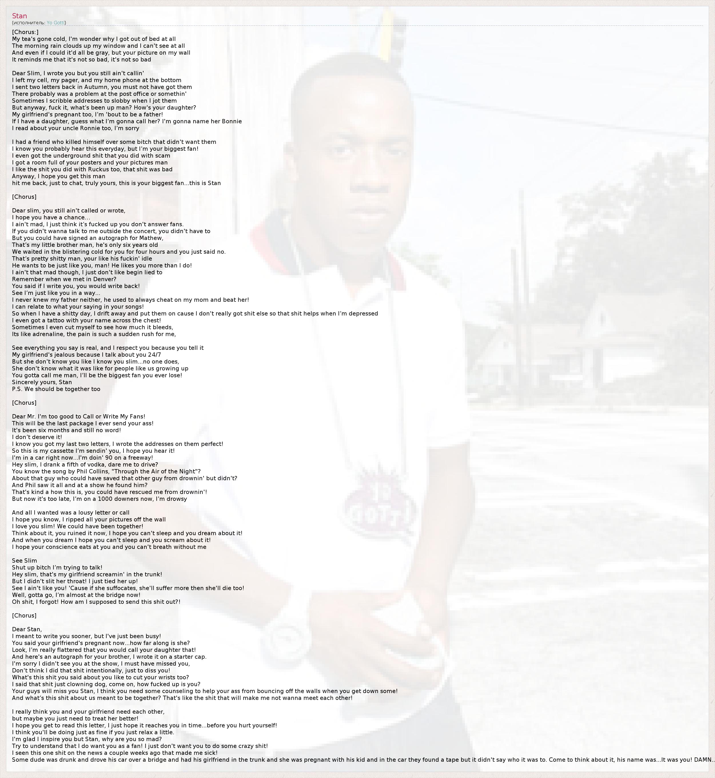 hit me back, just to chat, truly yours, this is your biggest fan...this is Stan