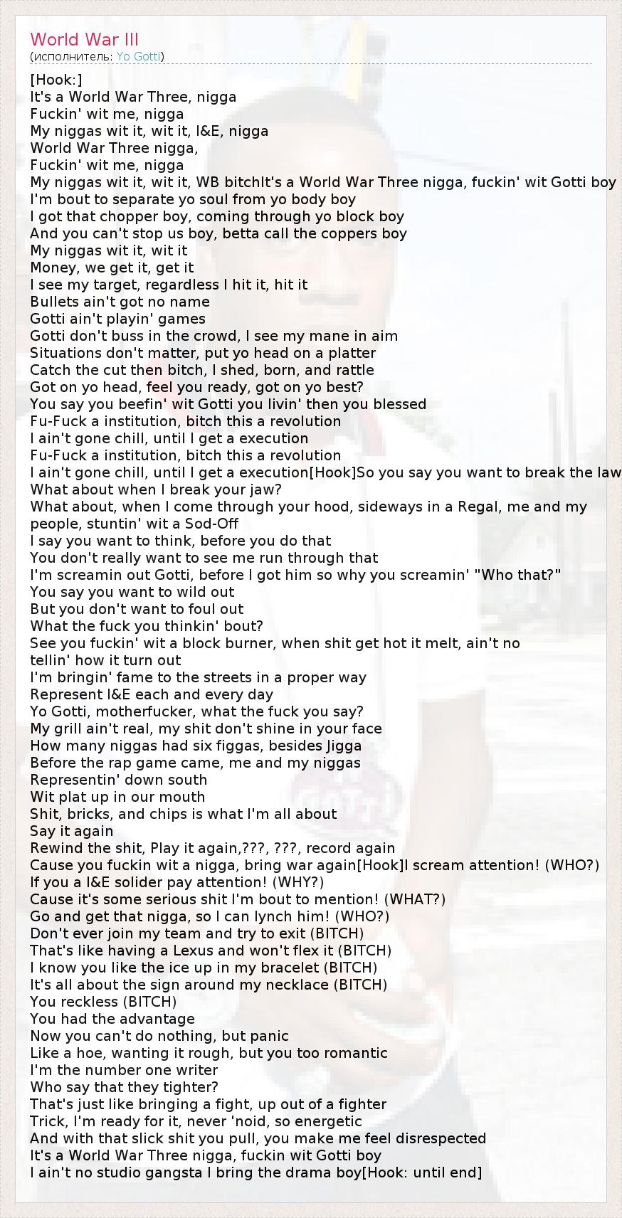 My niggas wit it, wit it, WB bitchIt's a World War Three nigga, fuckin' wit Gotti boy