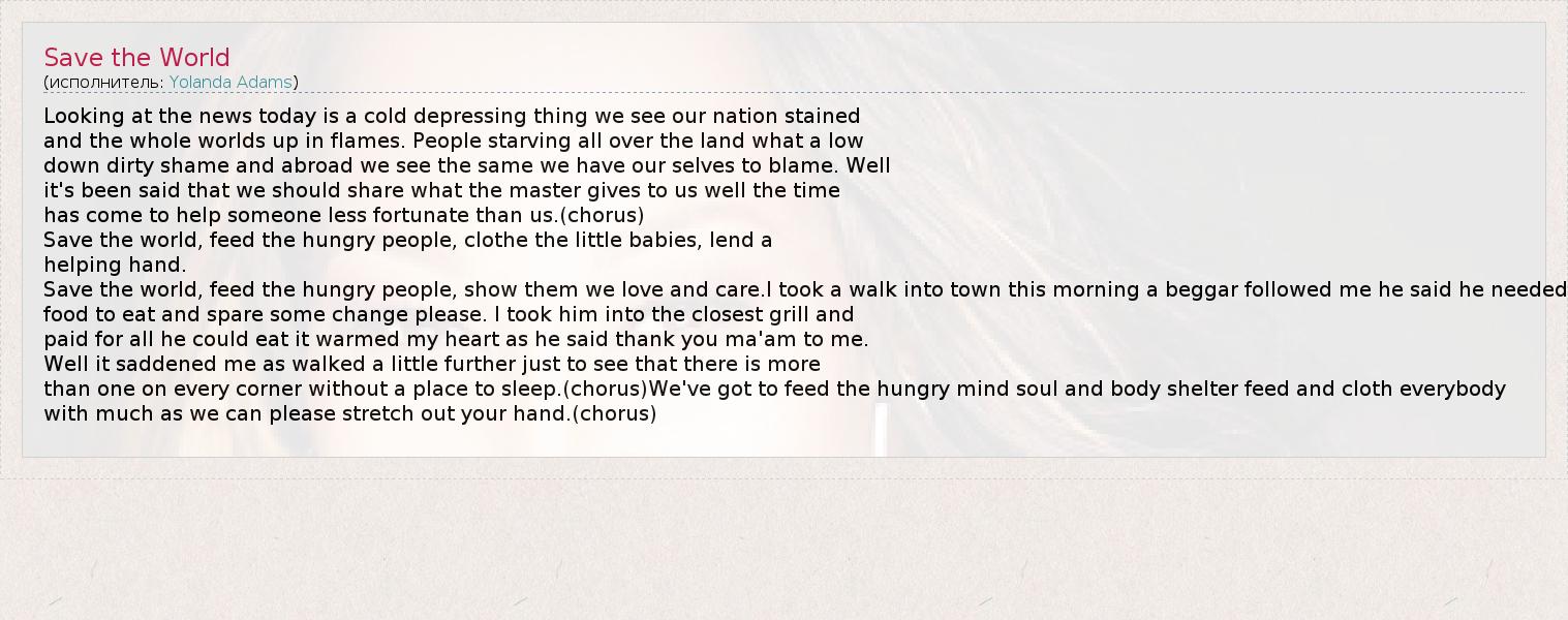 Это интересно:Иоланда Иветт Адамс (Yolanda Yvette Adams) родилась 27 августа 1961 года в Хьюстоне, штат Техас, США.Обладательница 4-х премий Грэмми, 4-х наград Gospel Music Association's Dove Awards, награды American Music Award, 7-ми наград American Music Award, награды Soul Train Music Award и 3-х наград BET Awards. Так же часто ее называют "Уинти Хьюстон" госпела из-за похожего сильного голоса.Окончила Sterling... продолжение