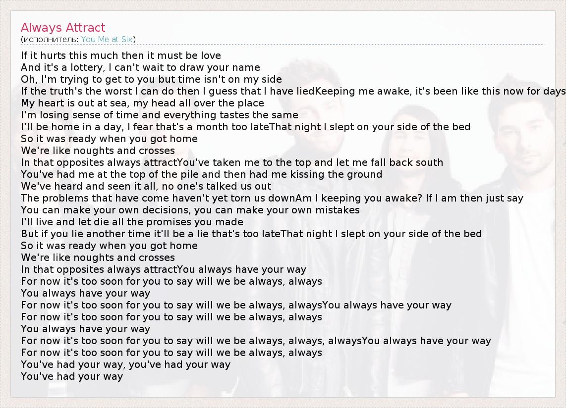 If it hurts this much then it must be love And it's a lottery, I can't wait to draw your name Oh, I'm trying to get to you but time isn't on my side If the truth's the worst I can do then I guess that I have liedKeeping me awake, it's been like this now for days My heart is out at sea, my head all over the place I'm losing sense of time and everything tastes the same I'll be home in a day, I fear that's a month too lateThat night I slept on your side of the bed So it was ready when you got home We're like noughts and crosses In that opposites always attractYou've taken me to the top and let me fall back south You've had me at the top of the pile and then had me kissing the ground We've heard and seen it all, no one's talked us out The problems that have come haven't yet torn us downAm I keeping you awake? If I am then just say You can make your own decisions, you can make your own mistakes I'll live and let die all the promises you made But if you lie another time it'll be a lie that's too lateThat night I slept on your side of the bed So it was ready when you got home We're like noughts and crosses In that opposites always attractYou always have your way For now it's too soon for you to say will we be always, always You always have your way For now it's too soon for you to say will we be always, alwaysYou always have your way For now it's too soon for you to say will we be always, always You always have your way For now it's too soon for you to say will we be always, always, alwaysYou always have your way For now it's too soon for you to say will we be always, always You've had your way, you've had your way You've had your way
