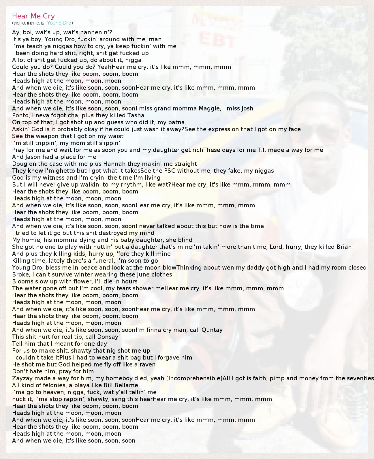 Fuck it, I'ma stop rappin', shawty, sang this hearHear me cry, it's like mmm, mmm, mmm