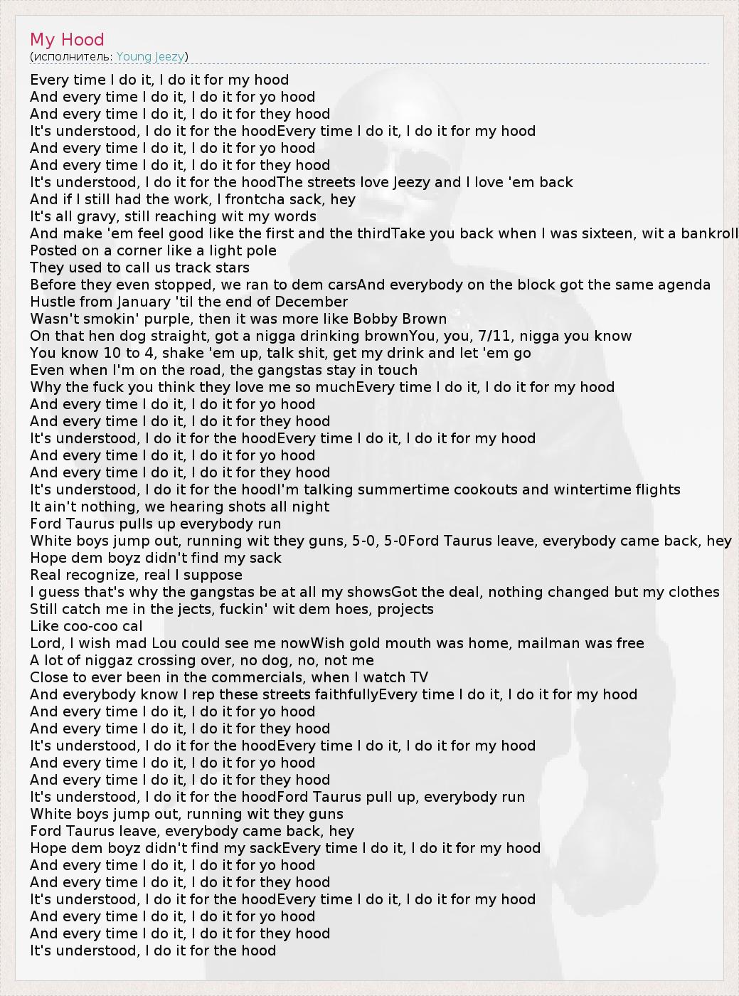 It's understood, I do it for the hoodEvery time I do it, I do it for my hood