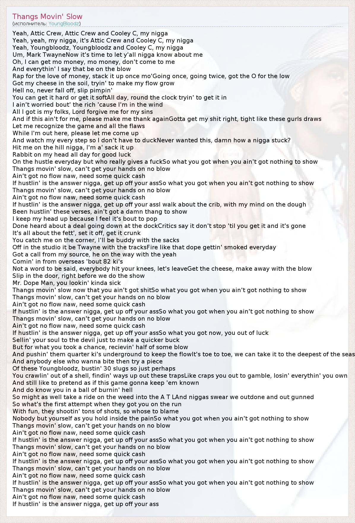 А как ты думаешь, о чем песня "Thangs Movin' Slow" ?
