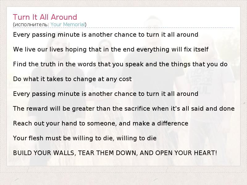 А как ты думаешь, о чем песня "Turn It All Around" ?
