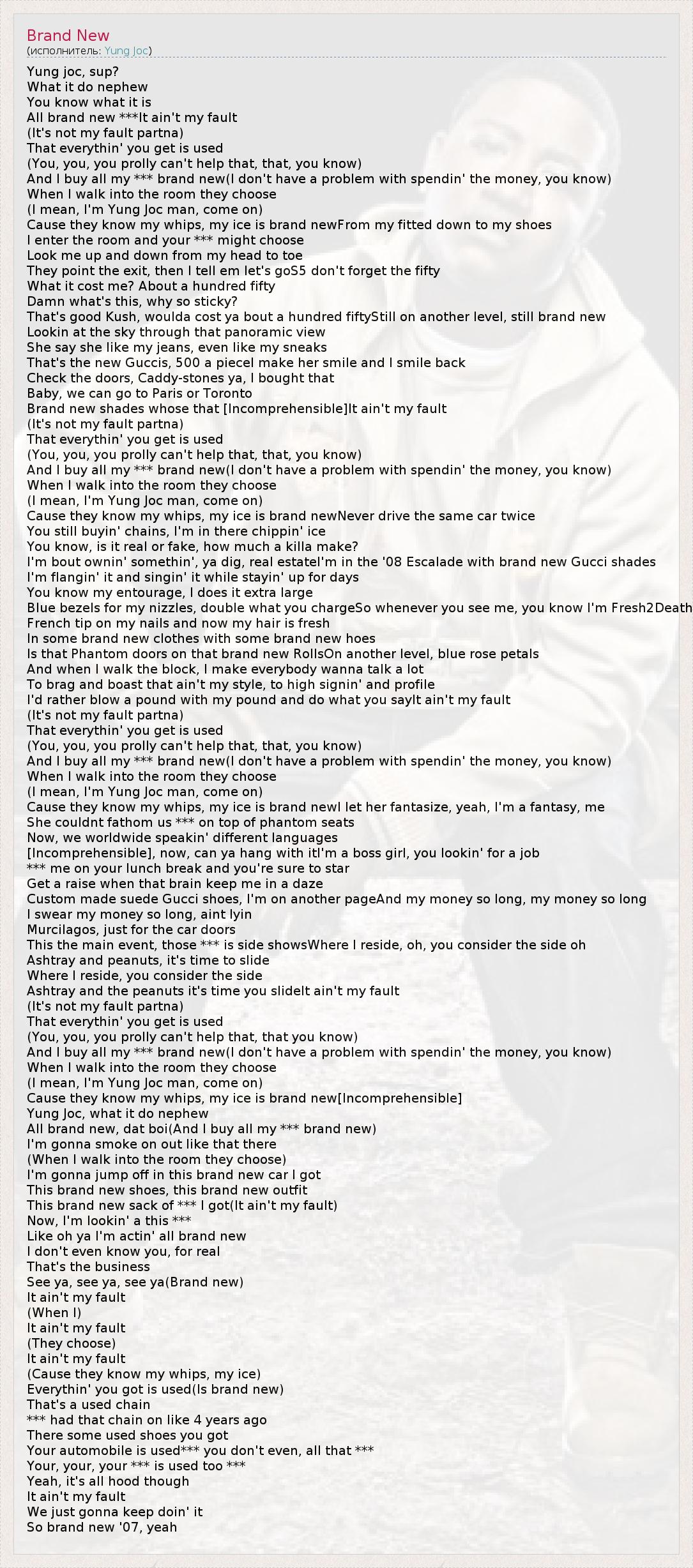And I buy all my *** brand new(I don't have a problem with spendin' the money, you know)