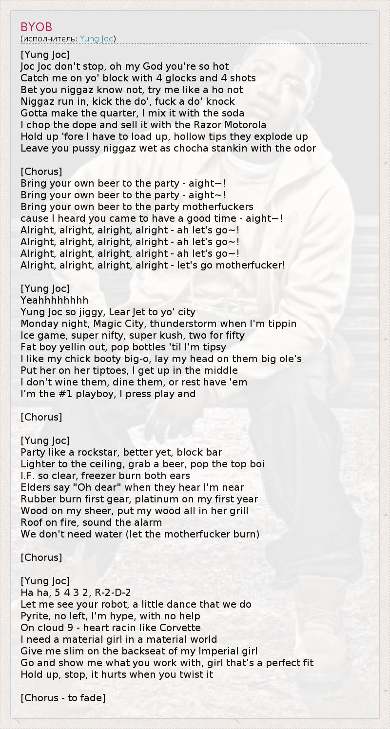 [Yung Joc] Joc Joc don't stop, oh my God you're so hot Catch me on yo' block with 4 glocks and 4 shots Bet you niggaz know not, try me like a ho not Niggaz run in, kick the do', fuck a do' knock Gotta make the quarter, I mix it with the soda I chop the dope and sell it with the Razor Motorola Hold up 'fore I have to load up, hollow tips they explode up Leave you pussy niggaz wet as chocha stankin with the odor [Chorus] Bring your own beer to the party - aight~! Bring your own beer to the party - aight~! Bring your own beer to the party motherfuckers cause I heard you came to have a good time - aight~! Alright, alright, alright, alright - ah let's go~! Alright, alright, alright, alright - ah let's go~! Alright, alright, alright, alright - ah let's go~! Alright, alright, alright, alright - let's go motherfucker! [Yung Joc] Yeahhhhhhhh Yung Joc so jiggy, Lear Jet to yo' city Monday night, Magic City, thunderstorm when I'm tippin Ice game, super nifty, super kush, two for fifty Fat boy yellin out, pop bottles 'til I'm tipsy I like my chick booty big-o, lay my head on them big ole's Put her on her tiptoes, I get up in the middle I don't wine them, dine them, or rest have 'em I'm the #1 playboy, I press play and [Chorus] [Yung Joc] Party like a rockstar, better yet, block bar Lighter to the ceiling, grab a beer, pop the top boi I.F. so clear, freezer burn both ears Elders say "Oh dear" when they hear I'm near Rubber burn first gear, platinum on my first year Wood on my sheer, put my wood all in her grill Roof on fire, sound the alarm We don't need water (let the motherfucker burn) [Chorus] [Yung Joc] Ha ha, 5 4 3 2, R-2-D-2 Let me see your robot, a little dance that we do Pyrite, no left, I'm hype, with no help On cloud 9 - heart racin like Corvette I need a material girl in a material world Give me slim on the backseat of my Imperial girl Go and show me what you work with, girl that's a perfect fit Hold up, stop, it hurts when you twist it [Chorus - to fade]