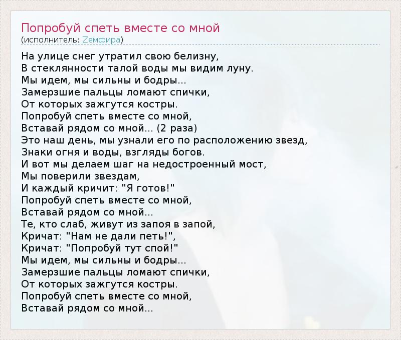 ГлавнаяИсполнителиZемфираПопробуй спеть вместе со мной