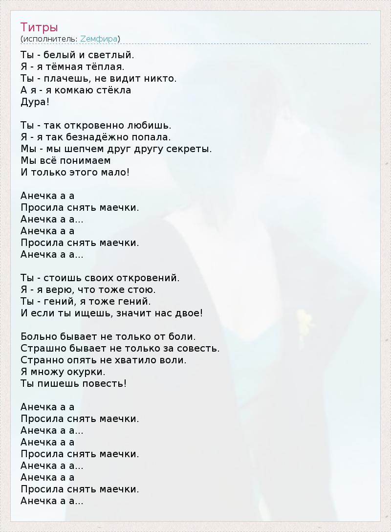 Ты - белый и светлый. Я - я тёмная тёплая. Ты - плачешь, не видит никто. А я - я комкаю стёкла Дура! Ты - так откровенно любишь. Я - я так безнадёжно попала. Мы - мы шепчем друг другу секреты. Мы всё понимаем И только этого мало! Анечка а а Просила снять маечки. Анечка а а... Анечка а а Просила снять маечки. Анечка а а... Ты - стоишь своих откровений. Я - я верю, что тоже стою. Ты - гений, я тоже гений. И если ты ищешь, значит нас двое! Больно бывает не только от боли. Страшно бывает не только за совесть. Странно опять не хватило воли. Я множу окурки. Ты пишешь повесть! Анечка а а Просила снять маечки. Анечка а а... Анечка а а Просила снять маечки. Анечка а а... Анечка а а Просила снять маечки. Анечка а а...