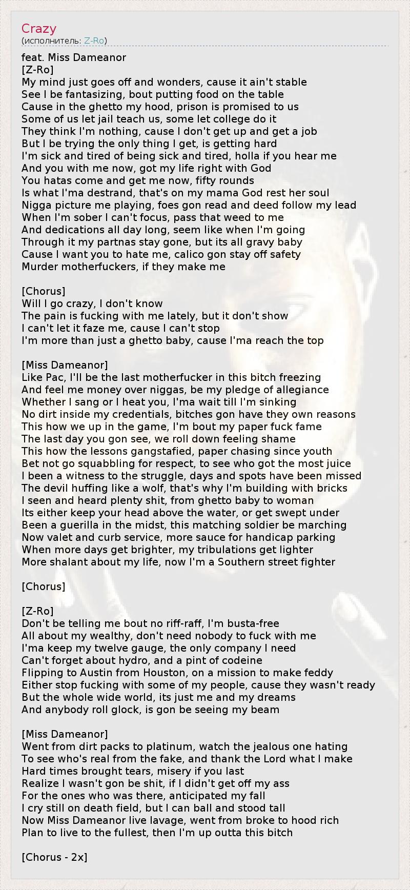 Это интересно:Joseph W. McVey, более известный под сценическим псевдонимом Z-Ro. Уроженец Хьюстона, начал свою карьеру в 1995 году.Имеет репутацию южного рэпера, однако звёздный статус не распространяется дальше Южных Штатов. Газета "New York Times" назвала его "Одним из самых недооценённых Американских рэперов".Альбом "I'm Still Livin' " был выпущен в 2006 году, в это время Z-Ro... продолжение
