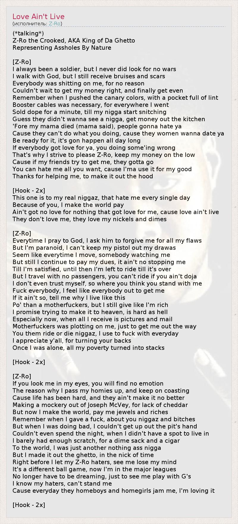 (*talking*) Z-Ro the Crooked, AKA King of Da Ghetto Representing Assholes By Nature [Z-Ro] I always been a soldier, but I never did look for no wars I walk with God, but I still receive bruises and scars Everybody was shitting on me, for no reason Couldn't wait to get my money right, and finally get even Remember when I pushed the canary colors, with a pocket full of lint Booster cables was necessary, for everywhere I went Sold dope for a minute, till my nigga start snitching Guess they didn't wanna see a nigga, get money out the kitchen 'Fore my mama died (mama said), people gonna hate ya Cause they can't do what you doing, cause they women wanna date ya Be ready for it, it's gon happen all day long If everybody got love for ya, you doing some'ing wrong That's why I strive to please Z-Ro, keep my money on the low Cause if my friends try to get me, they gotta go You can hate me all you want, cause I'ma use it for my good Thanks for helping me, to make it out the hood [Hook - 2x] This one is to my real niggaz, that hate me every single day Because of you, I make the world pay Ain't got no love for nothing that got love for me, cause love ain't live They don't love me, they love my nickels and dimes [Z-Ro] Everytime I pray to God, I ask him to forgive me for all my flaws But I'm paranoid, I can't keep my pistol out my drawas Seem like everytime I move, somebody watching me But still I continue to pay my dues, it ain't no stopping me Till I'm satisfied, until then I'm left to ride till it's over But I travel with no passengers, you can't ride if you ain't doja I don't even trust myself, so where you think you stand with me Fuck everybody, I feel like everybody out to get me If it ain't so, tell me why I live like this Po' than a motherfuckers, but I still give like I'm rich I promise trying to make it to heaven, is hard as hell Especially now, when all I receive is pictures and mail Motherfuckers was plotting on me, just to get me out the way You them ride or die niggaz, I use to fuck with everyday I appreciate y'all, for turning your backs Once I was alone, all my poverty turned into stacks [Hook - 2x] [Z-Ro] If you look me in my eyes, you will find no emotion The reason why I pass my homies up, and keep on coasting Cause life has been hard, and they ain't make it no better Making a mockery out of Joseph McVey, for lack of cheddar But now I make the world, pay me jewels and riches Remember when I gave a fuck, about you niggaz and bitches But when I was doing bad, I couldn't get up out the pit's hand Couldn't even spend the night, when I didn't have a spot to live in I barely had enough scratch, for a dime sack and a cigar To the world, I was just another nothing ass nigga But I made it out the ghetto, in the nick of time Right before I let my Z-Ro haters, see me lose my mind It's a different ball game, now I'm in the major leagues No longer have to be dreaming, just to see me play with G's I know my haters, can't stand me Cause everyday they homeboys and homegirls jam me, I'm loving it [Hook - 2x]