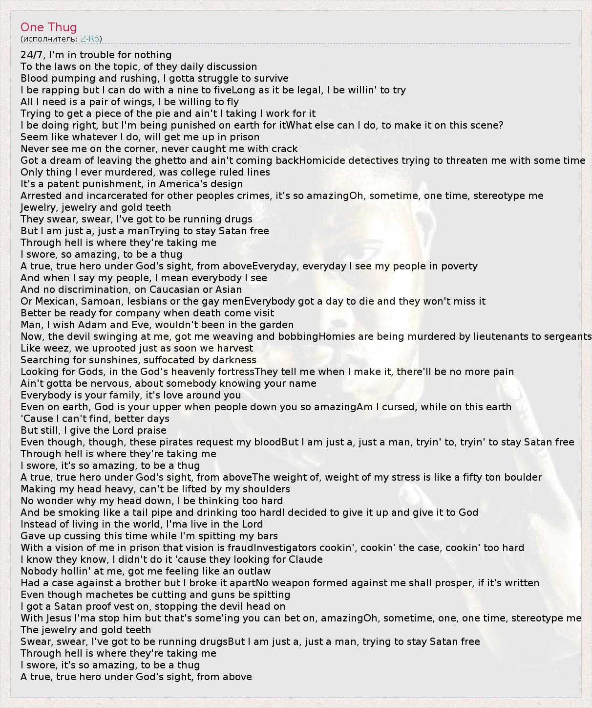 Это интересно:Joseph W. McVey, более известный под сценическим псевдонимом Z-Ro. Уроженец Хьюстона, начал свою карьеру в 1995 году.Имеет репутацию южного рэпера, однако звёздный статус не распространяется дальше Южных Штатов. Газета "New York Times" назвала его "Одним из самых недооценённых Американских рэперов".Альбом "I'm Still Livin' " был выпущен в 2006 году, в это время Z-Ro... продолжение